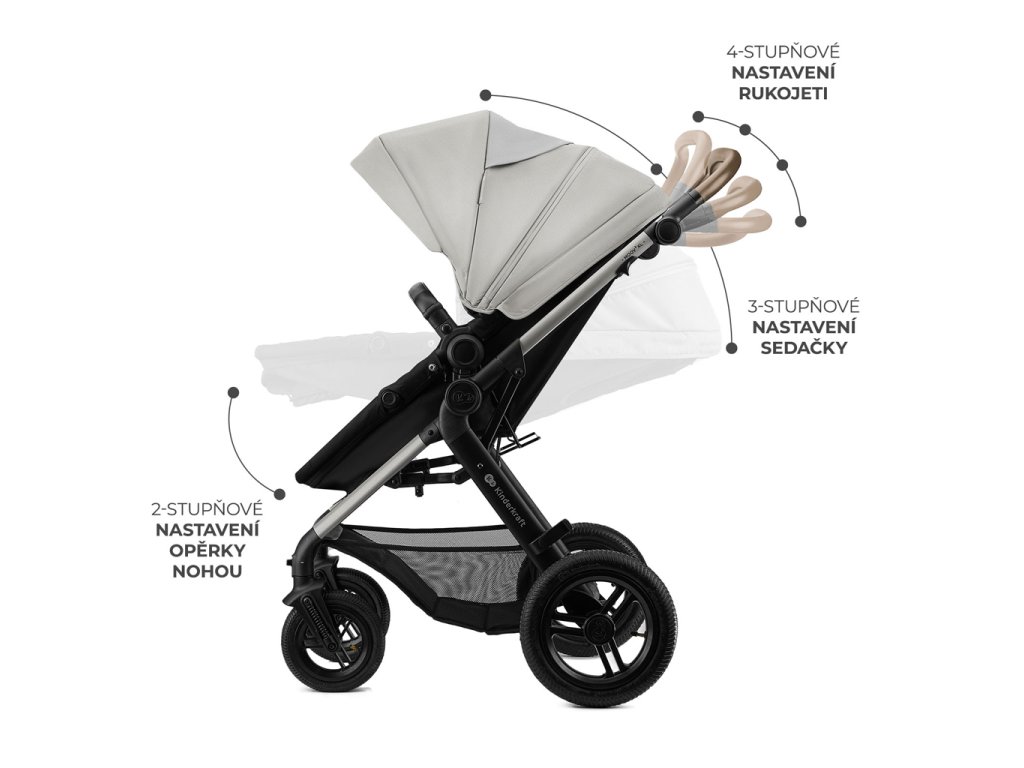 Plne nastaviteľný športový kočík: kočík sa prispôsobí potrebám dieťaťa aj rodiča. Sedadlo má 3 polohy nastavenia, opierka nôh 2 úrovne a rodičovská rukoväť je nastaviteľná do jednej zo 4 polôh.
