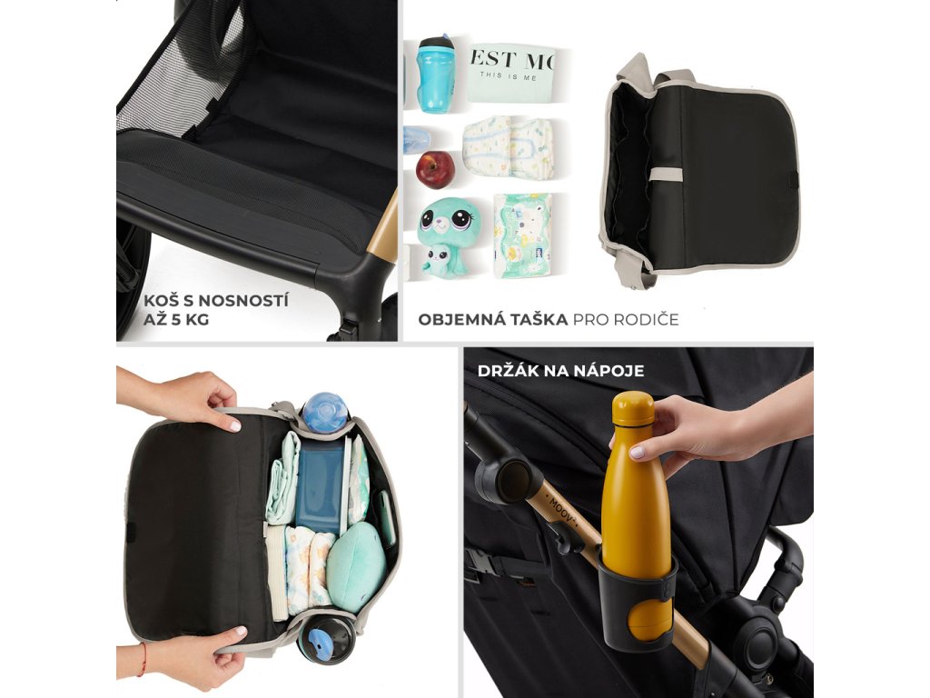 Kompletná sada príslušenstva: kočík MOOV 2 XL obsahuje všetko potrebné na pohodlnú prechádzku: držiak na nápoje, univerzálny kryt na nohy (na vaničku aj kočík), moskytiéru, pláštenku, tašku pre rodičov a adaptéry na autosedačku.