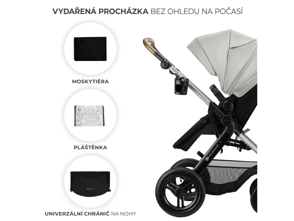 - Sada praktického príslušenstva (moskytiéra, pláštenka, univerzálny kryt na nohy, taška pre rodičov, držiak na pohár).