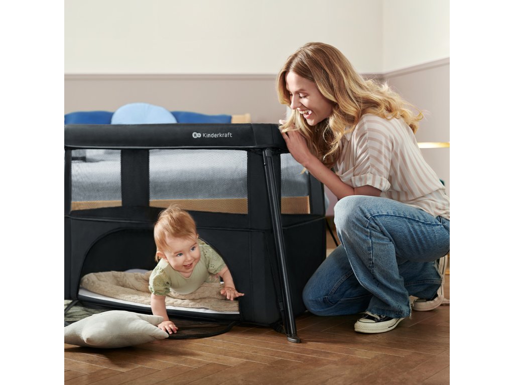 Ohrádka má praktický bočný otvor, cez ktorý môže dieťa samo vyliezť. Boky postieľky sú vyrobené zo vzdušnej sieťoviny, ktorá umožňuje rodičovi mať dieťa stále na očiach – či už spí alebo sa hrá. Sieťovina zároveň zaisťuje správnu cirkuláciu vzduchu, čo oceníte najmä v horúcich dňoch.