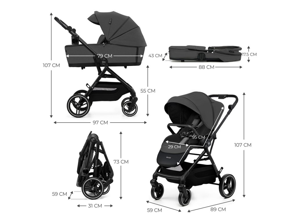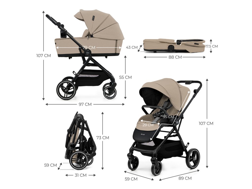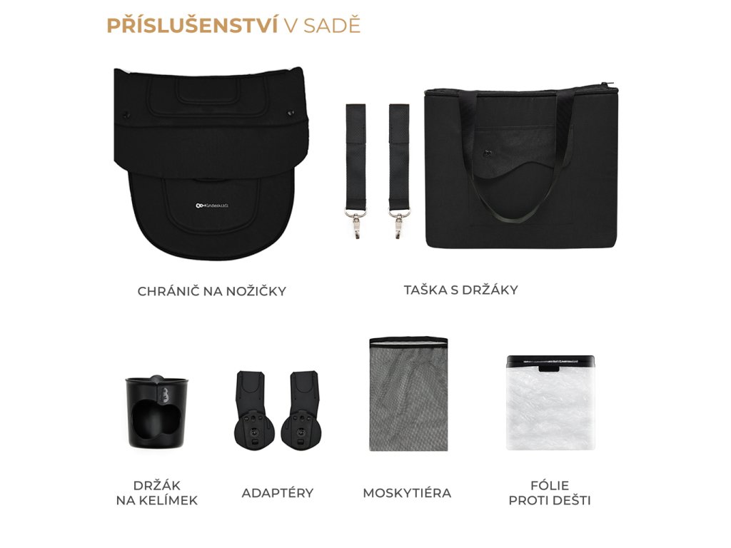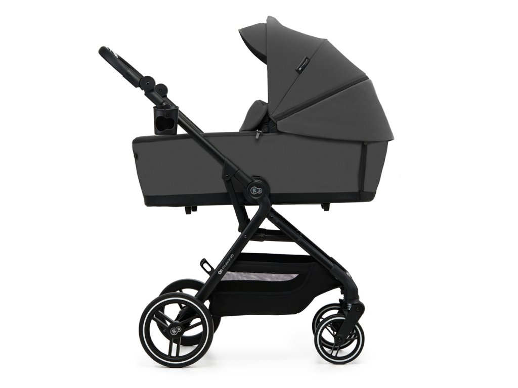Veľkorysý kôš s nosnosťou až 5 kg pojme všetky potrebné veci. Ďalšia deka a plienky? Alebo nákupy, ktoré ste urobili po ceste domov? Jednoduchý prístup z oboch strán vám umožní rýchlo vytiahnuť každú vec. Kočík sa dodáva aj s príslušenstvom: sieťkou proti hmyzu (v opierke na nohy, ktorú budete mať vždy so sebou), kryt na nožičky, pláštenkou proti dažďu, držiakom na pohár, taškou na rukoväť pre rodiča a adaptérmi na autosedačku.