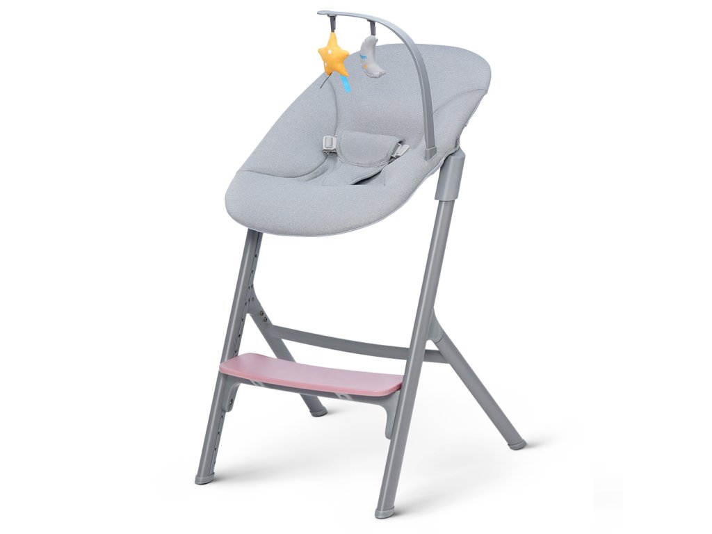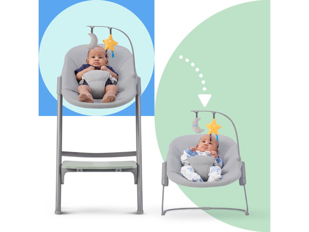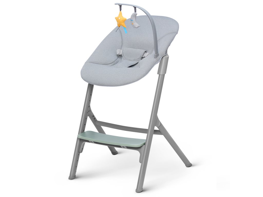 - vysoká hojdačka od narodenia – ležadlo sa môže používať spolu so stoličkou alebo samostatne. Vďaka závesným hračkám si bude dieťa trénovať jemnú motoriku.
