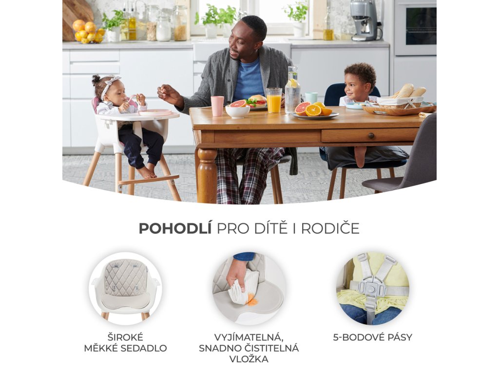 - 5-bodové nastaviteľné bezpečnostné pásy, ktorých dĺžku jednoducho prispôsobíte výške dieťaťa.