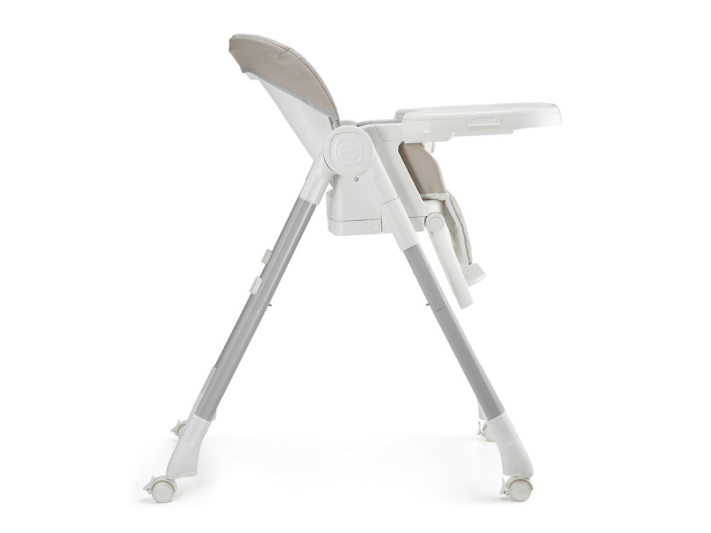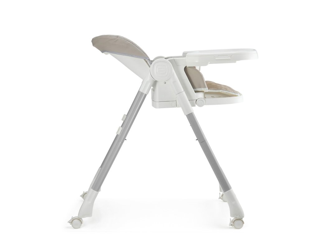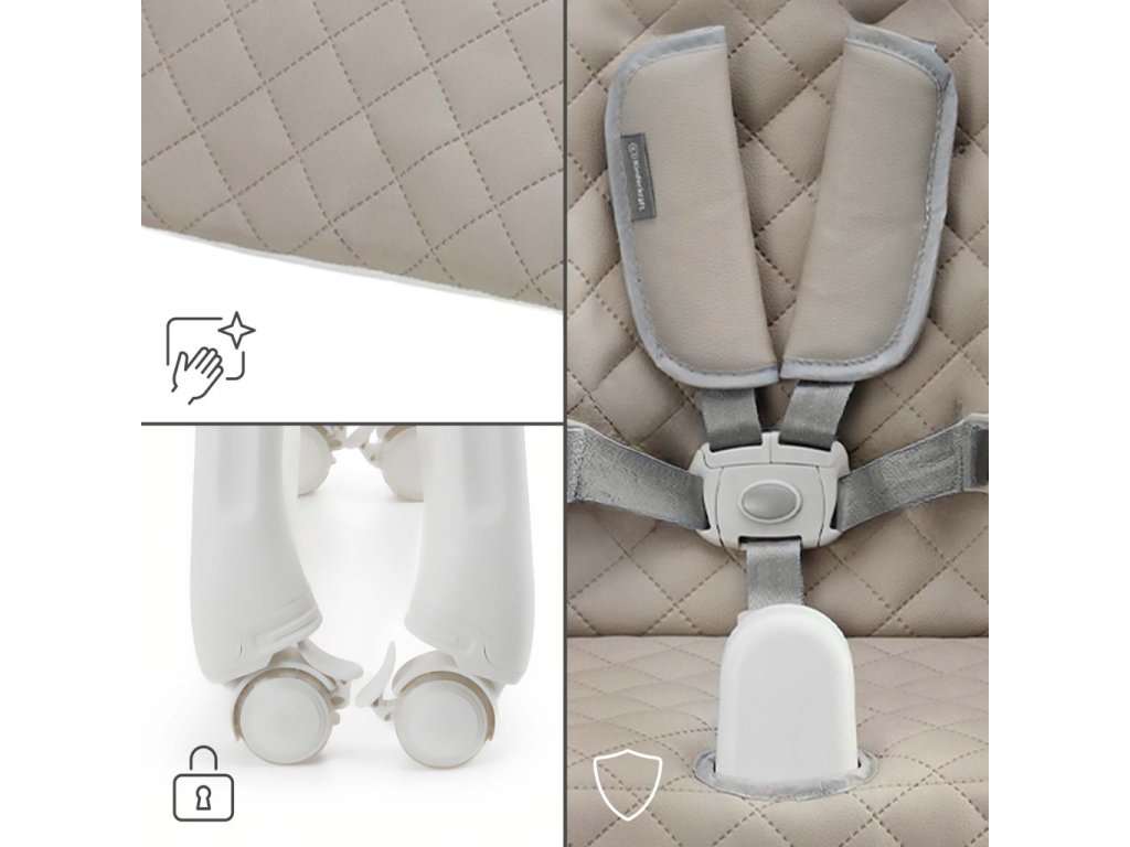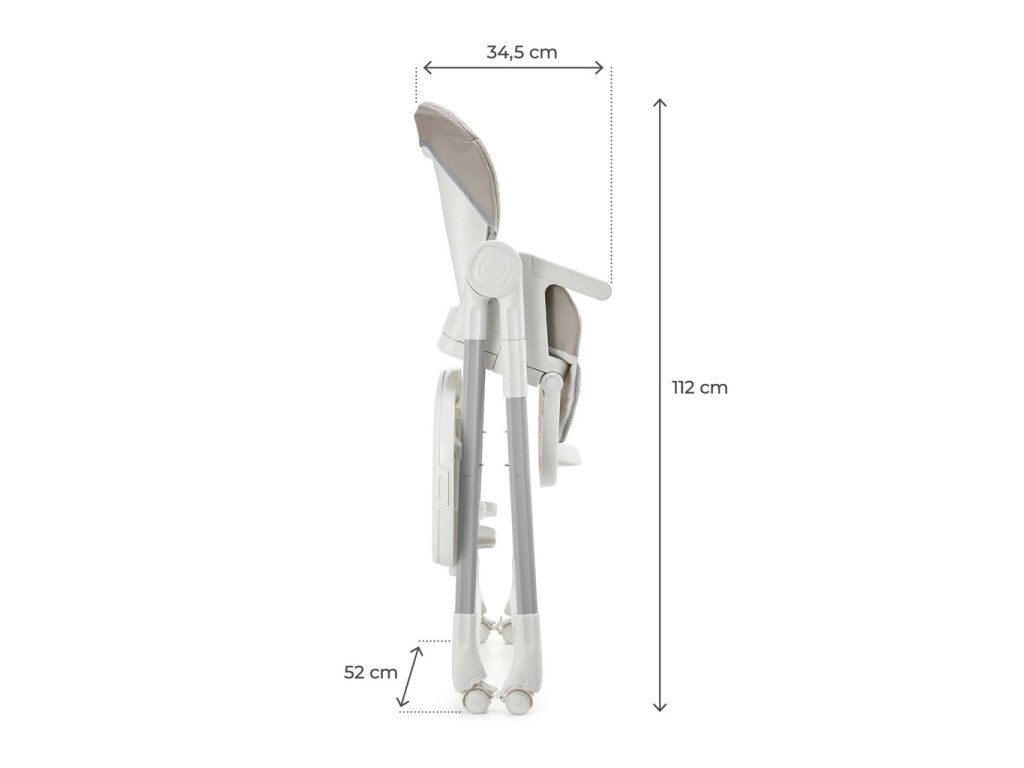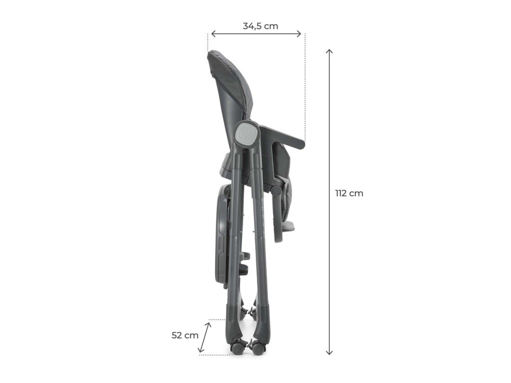 Integrované kolieska s brzdami, 5-bodové bezpečnostné pásy a mäkké, ľahko čistiteľné PU čalúnenie zvyšujú pohodlie a bezpečnosť dieťaťa. Po zložení má stolička mimoriadne kompaktný tvar, čo uľahčuje jej uskladnenie. Zaberá minimum miesta, takže sa ľahko zmestí do rohu alebo skrine.