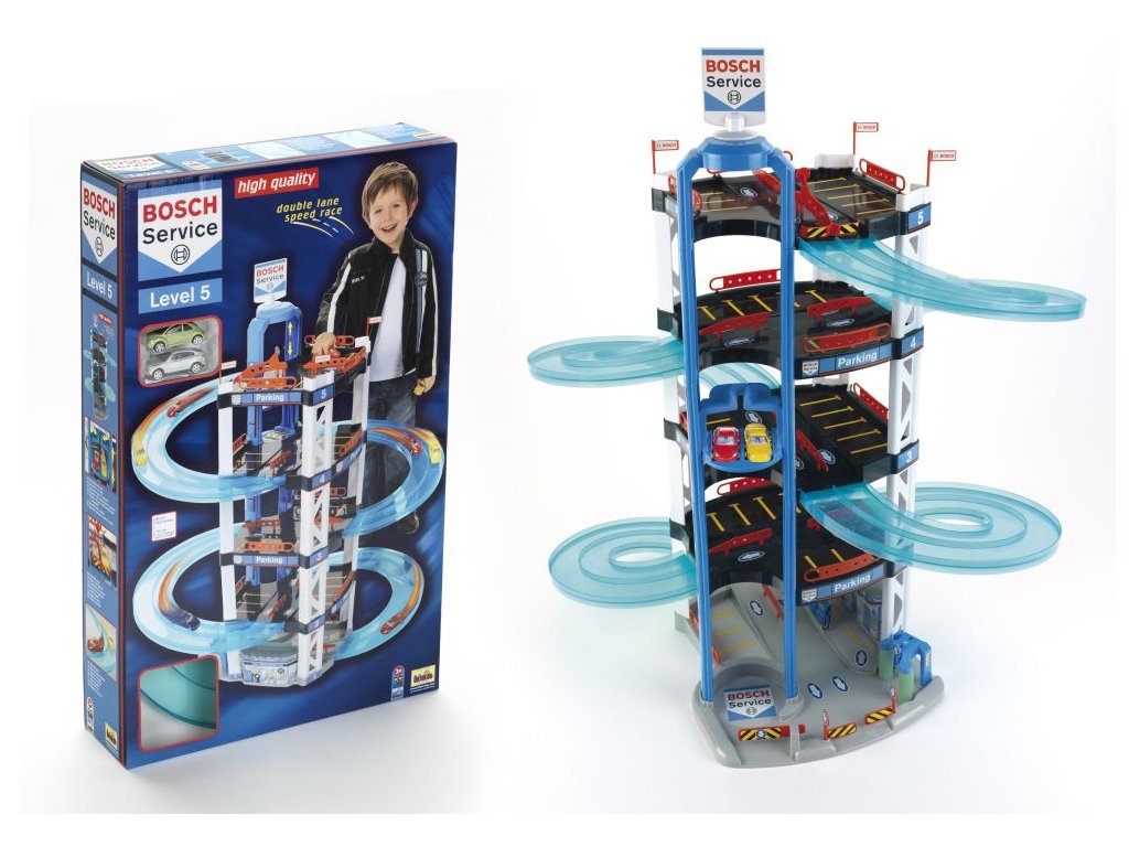 Garáž Bosch, 5 poschodí. Moderná garáž s čerpacou stanicou a umývačkou. Z hornej časti môžu autíčka pretekať, ktoré príde nadol skôr. Vrátane dvoch autíčok, výška 85 cm. Vhodné pre deti od 3 rokov.