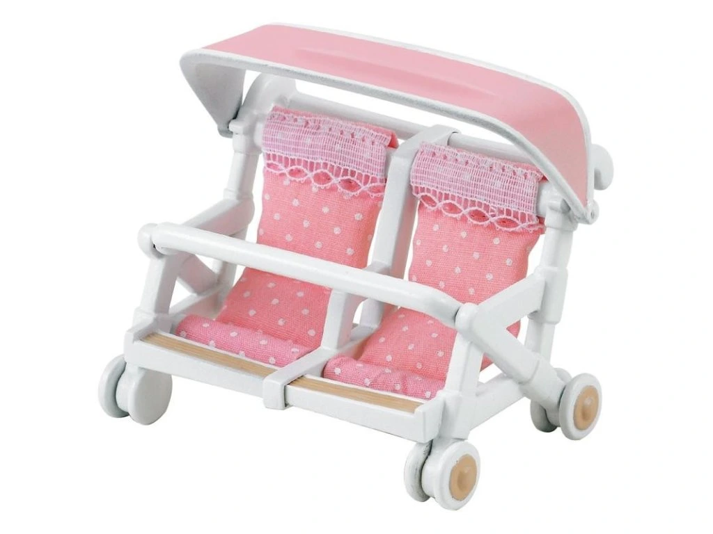Kočík s miestom pre 2 králiky - dvojčatá, je dostatočne priestranný. Dĺžka 9 cm a výška striešky 8,5 cm. Kolieska sú otáčacie, kočík jazdí. V kočíku je perinka pre obe bábätká + jedna pokrývka z mäkkého materiálu na prikrytie. Bábätká sú vysoké 4 cm, v oblečení, ktoré možno zložiť a opätovne navliecť. Jedno bábätko spinká a druhé kľačí a cmúľa cumlík. V prípade plaču je po ruke hrkálka alebo dudlíček a na hlad zaberie fľaša s mliečkom. Set obsahuje: kočík, perinku a 4 doplnky pre bábätká - 2 hrkálky, cumlík, fľašu s mliekom. Vek: 3+