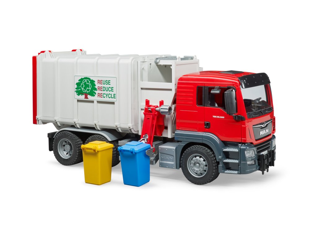 Novým prírastkom do flotily nákladných vozidiel BRUDER je moderné nákladné vozidlo s bočným nakladačom na báze MAN TGS. Zdvihák, ktorý je možné vysunúť zo strany, uchopí popolnice a vyprázdni ich bez potreby druhej osoby, dva skrutkové lisy prepravia odpadky vo vnútri nakladacej korby, ktorá sa nakloní, aby sa vysypali, a otvorené zadné výklopné dvere sú zaistené na mieste. S touto detailnou hračkou je možné vzrušujúcu tému likvidácie odpadu realisticky zopakovať. Balenie: 19,5x28,5x58cm. Vek: 3+