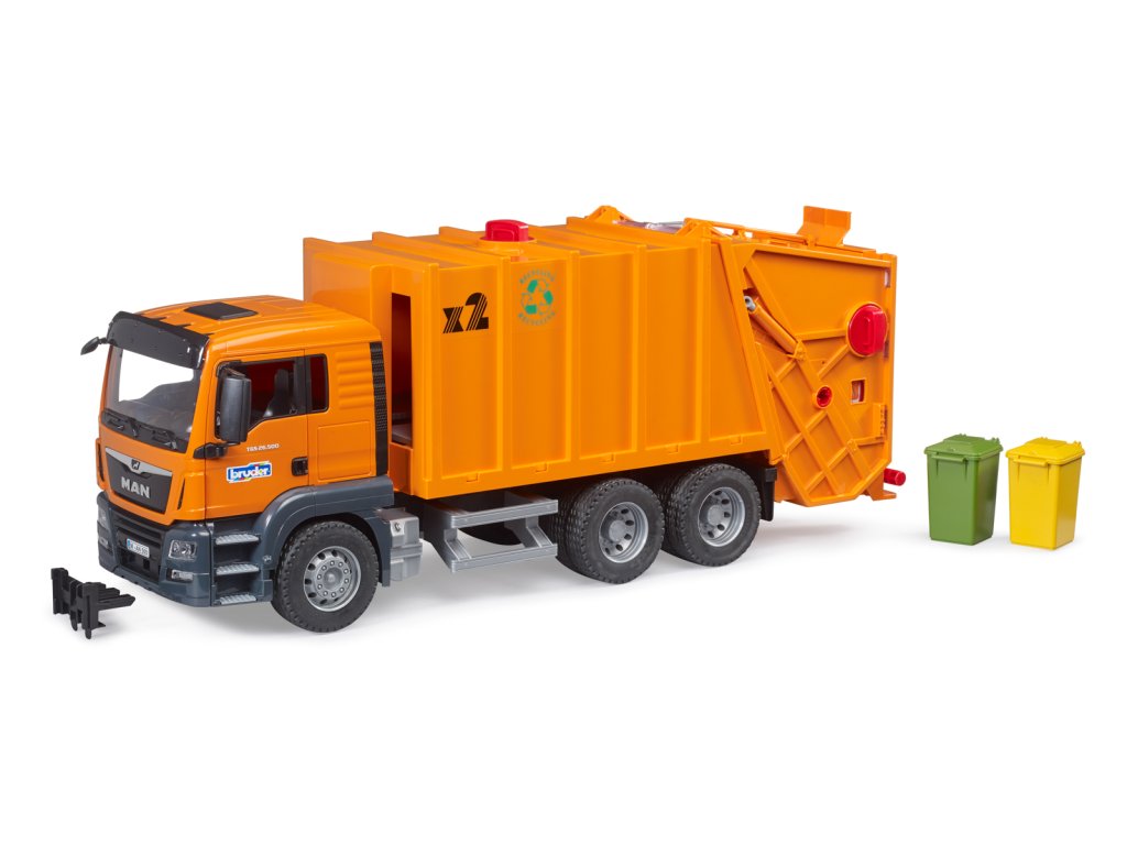 MAN TGS je perfektný všestranný automobil pre stavenisko, diaľkovú dopravu a miestnu distribúciu. Robustne postavený, vybavený motormi s vysokým krútiacim momentom a nadpriemerným užitočným zaťažením je tento nákladný automobil prototypom toľko popisovaného „všestranného vozidla“. Dvojfarebná kabína vodiča má dvere, ktoré je možné otvoriť a ponúka každej postave bworld moderné pracovisko. Celý proces nakladania a vykladania smetiarskeho vozidla je riadený unikátnym otočným kolieskovým mechanizmom, ktorý umožňuje vysypanie dvoch popolníc súčasne. Rovnaký postup je možný aj s odpadovou nádobou vďaka flexibilnému nosnému držiaku. Postup: odpadkové koše sa zasunú do nosnej konzoly, odpadky sa potom vysypú do žľabu zdvihnutím. Toto je za otáčanie kolesa vtiahnuté do funkčného lisovacieho mechanizmu, zhutnené a následne transportované do odpadového priestoru. Tento proces je vizualizovaný pomocou priehľadového okna. Na vysypanie odpadu slúži rukoväť pripevnená k hornej časti odpadového priestoru. Otočením tejto rukoväte je odpad transportovaný von pomocou vynášacieho vozíka okolo nakladacej a vykladacej jednotky, ktorá bola vytlačená nahor. Dva malé priložené popolnice a behúne dotvárajú herné pole. Rozmery: 20,5x29x71cm. Vek: 3+