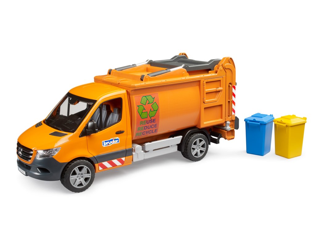 Výhľadový, efektívny, spoľahlivý – tak Mercedes Benz opisuje nový Sprinter. Kompaktné vozidlo na zvoz odpadu je k dispozícii v úzkych mestských častiach a v peších zónach. Toto dôležité vozidlo pre všetkých poskytovateľov komunálnych služieb sa teraz opäť objavuje v mierke 1:16. Malé popolnice a vrecia na odpad je možné vyprázdňovať s rovnakým dôrazom na detail ako originál. Dve bočné dvierka sú tu pre vrecia a zabudnuté odpadky. Pri vyprázdňovaní smetí alebo kontajnerov na odpad sa automaticky otvorí horný koncový poklop vozidla. Po spustení popolníc sa poklop opäť uzavrie. Vozidlo sa vyprázdni odomknutím a otvorením zadných výklopných dverí. Súprava popolníc BRUDER (č. položky 02607) je k dispozícii s vozidlom. 44,2 cm × 16,5 cm × 19,8 cm. Vyrobené z vysoko kvalitného ABS plastu. Rozmery vozidla: 44,2 cm × 16,5 cm × 19,8 cm. Vek: 4+
