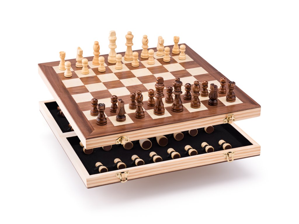 Luxusné prevedenie šachu v praktickom drevenom boxe. Šachovnica je spracovaná ako intarzia dvoch farieb dreva. Figúrky sa po skončení hry umiestnia dovnútra. Súčasťou hry je návod. Rozmer: 38 x 20 x 5,5 cm