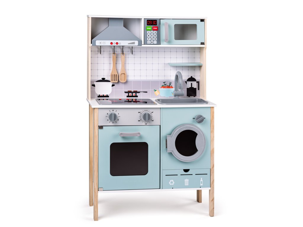 Kuchynská linka so zvukovými a svetelnými efektmi. Po zapnutí sa platnička rozsvieti červeným svetlom a ozve sa zvuk praskajúceho oleja, do ktorého sme práve položili čerstvo obalený rezeň. Digestor má hneď dve tlačidlá: po zmáčknutí prvého sa rozsvietenia svetla, druhé aktivuje zvuk ventilátora. Mikrovlnná rúra je tiež vybavená svetlom. Skutočným prínosom je tu prvok, kedy hrou učíme a vychovávame deti k ekologickému zmýšľaniu. Kuchynka totiž obsahuje kartičky s obrázkami použitých obalov, zvyškov jedál, sklenených fliaš a ďalšieho odpadu. Úlohou dieťaťa je správne tento odpad roztriediť a vložiť ho do správneho otvoru. Svojim jednoduchým dizajnom a atraktívnou pastelovo tyrkysovou farbou je skutočnou ozdobou každej detskej izbičky. | Vek: 3+ | Rozmer: 60 x 29,5 x 95 cm | Výška pracovnej dosky: 53 cm |