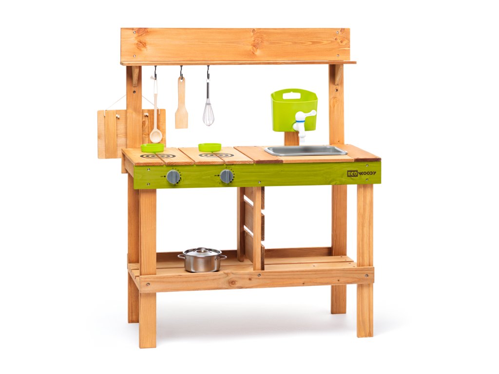 Z jednej strany kuchynka s dvoma varičmi, z druhej výdajňa jedál. Súčasťou kuchynky je zásobník na vodu, vďaka ktorému môže dieťa skutočne omývať ovocie, zeleninu, ale aj riad a náčinie, ktoré je súčasťou tohto výrobku. Hra s vodou deti nadchne a plnenie zásobníka sa tak stane veľmi populárnou činnosťou. Drez pod kohútikom je vyberateľný a môže sa tak vylievať podľa potreby. Pod drezom je priestor na uskladnenie zásob na prípravu pokrmov. Na čiernu tabuľku z výdajnej strany kuchyne môžu deti napísať či nakresliť, aké jedlo dnes pre svojich kamarátov pripravili. Záhradná kuchynka je ošetrená glazúrou vhodnou pre deti a je šetrná k životnému prostrediu. Chráňte pred poveternostnými vplyvmi (viac informácií nájdete v priloženom návode). Vek: 3+. Rozmer: 77 x 95 x 34 cm. Výška pracovnej plochy: 56 cm.