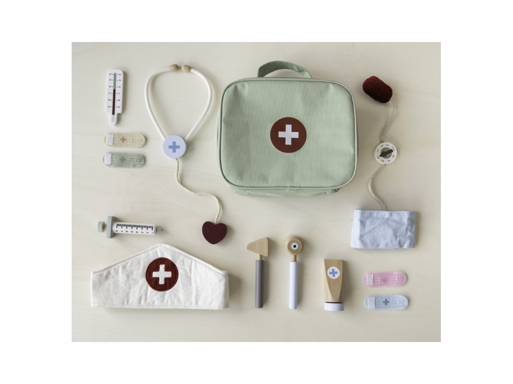 Sada obsahuje: plátenú lekársku tašku, náplaste (4 rôzne farby), teplomer, striekačku, tubu s masťou, stetoskop, reflexné kladivko, tlakomer, otoskop a lekársku čiapku.