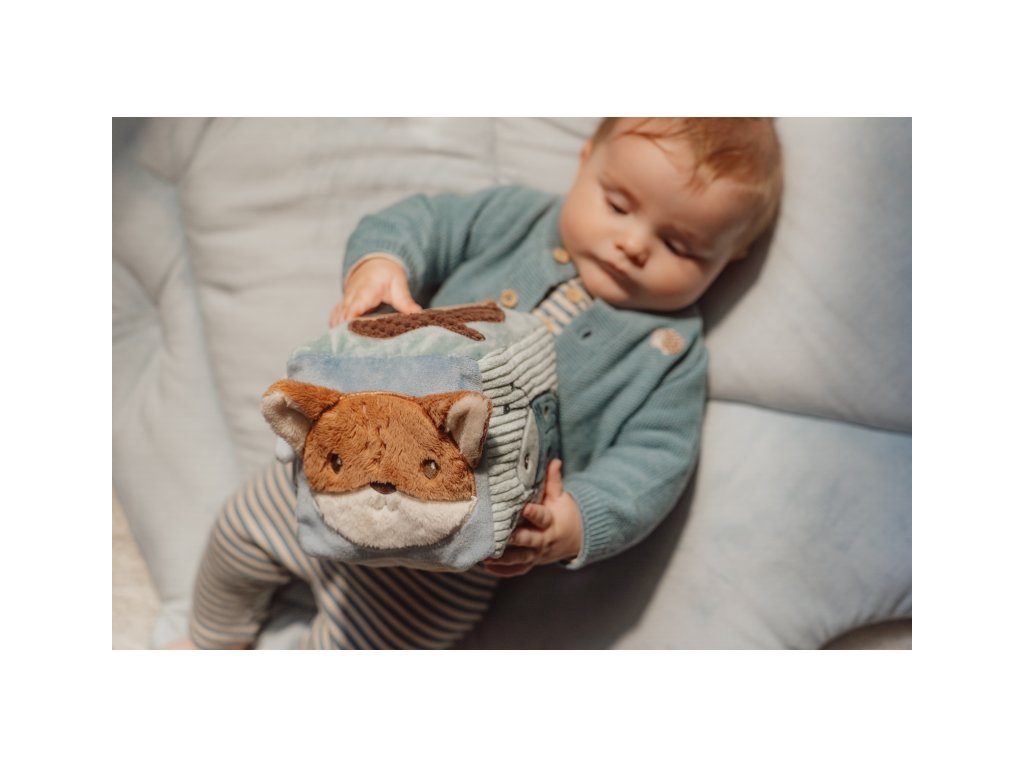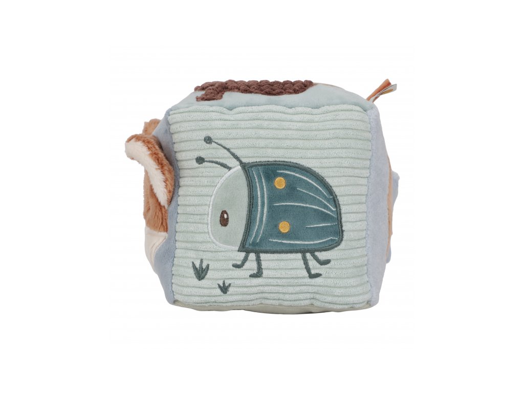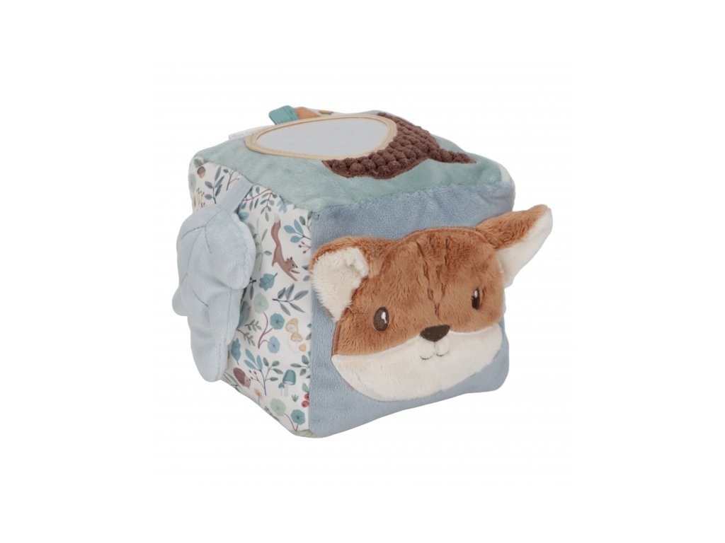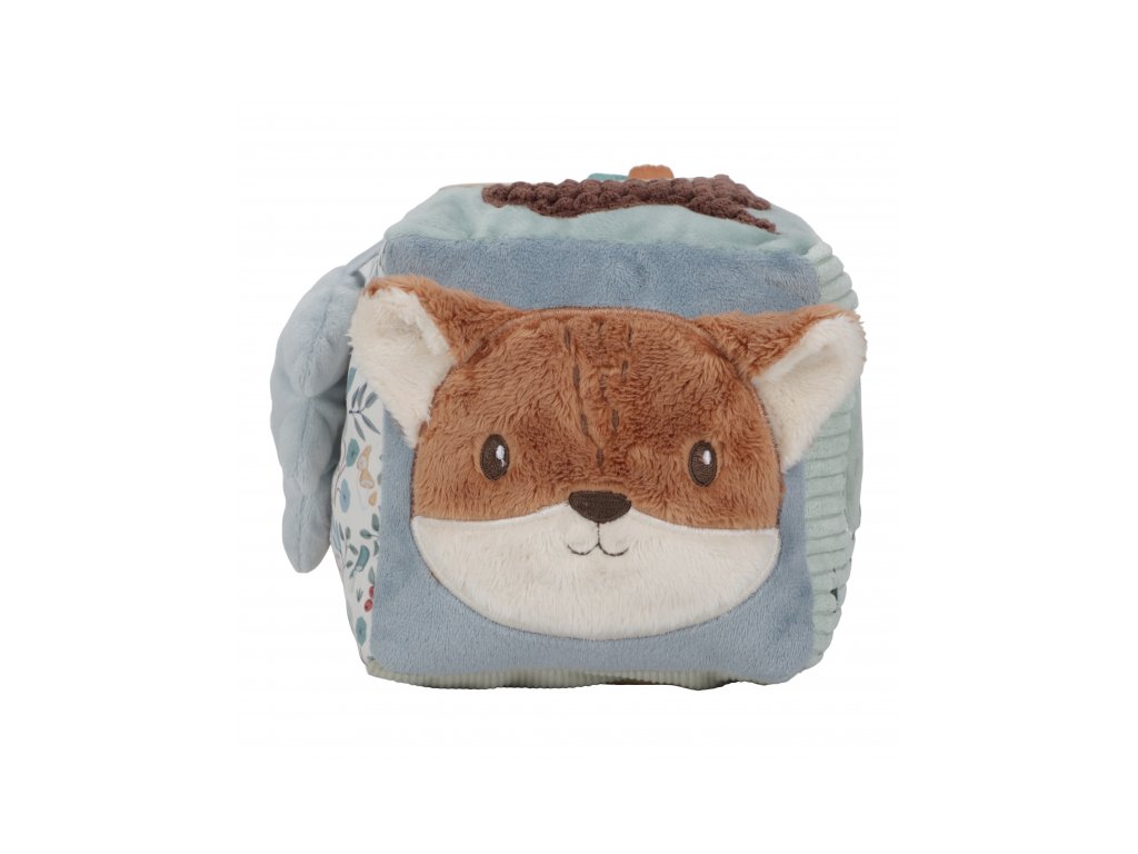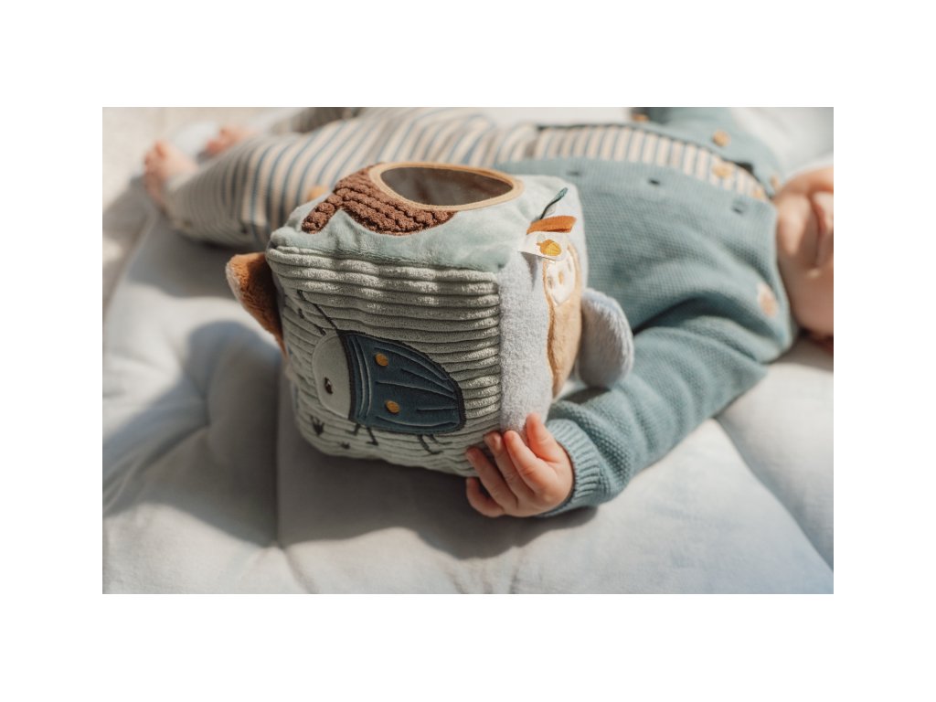 Mäkká plyšová kocka s krásnymi motívmi zo života v lese je vďaka svojmu prevedeniu ľahko uchopiteľná malými detskými ručičkami. Rôznorodé textúry, pripevnené hračky a vyšívané ilustrácie lákajú dieťa na skúmanie, kocka navyše pri pohybe jemne cinká.