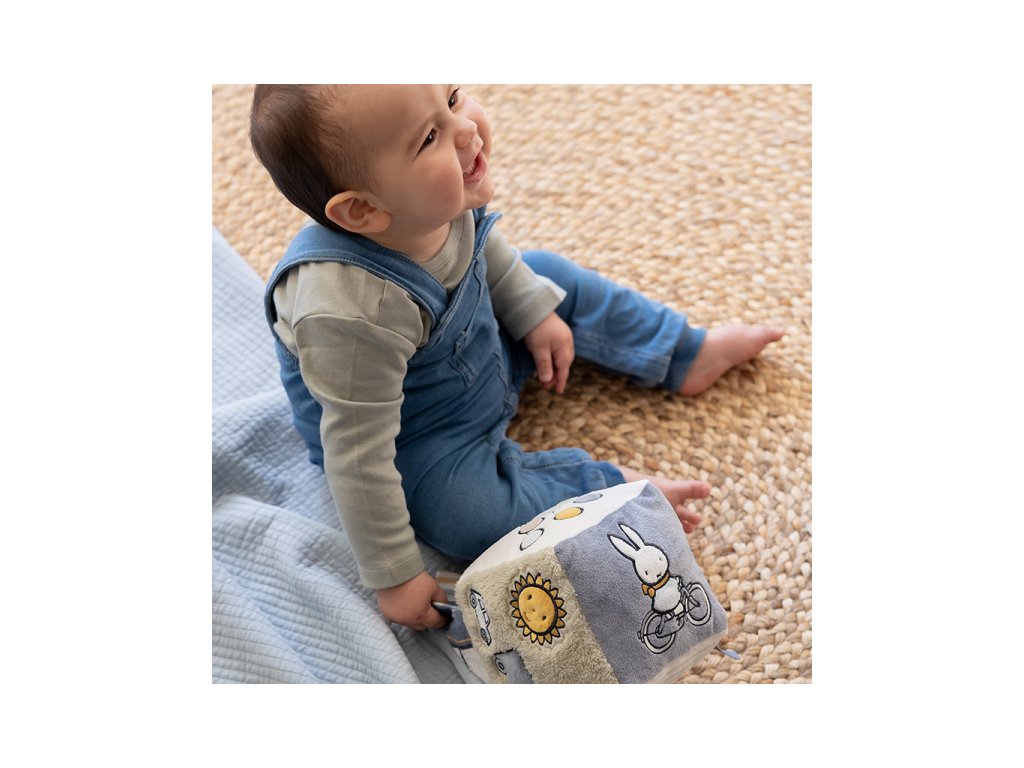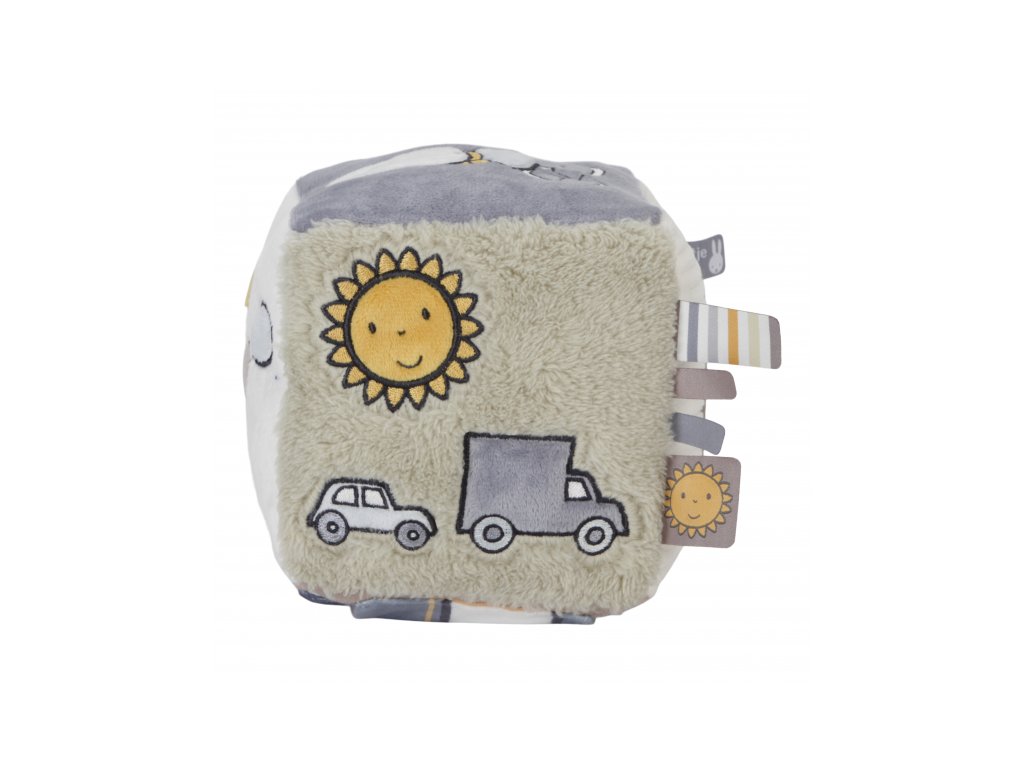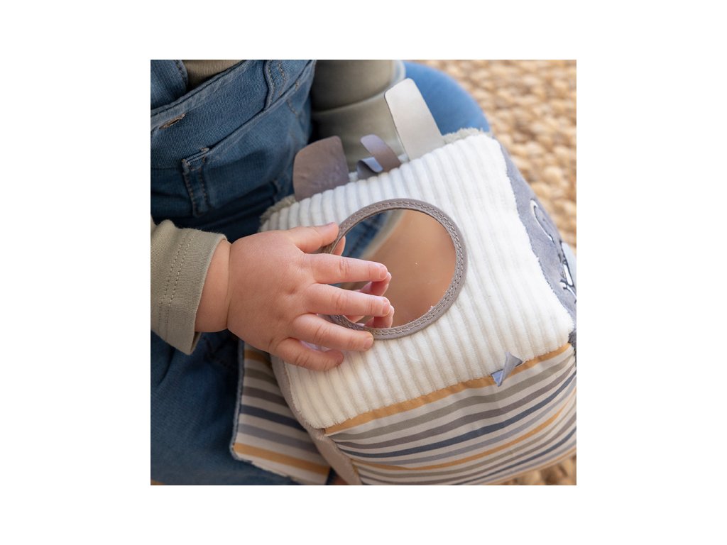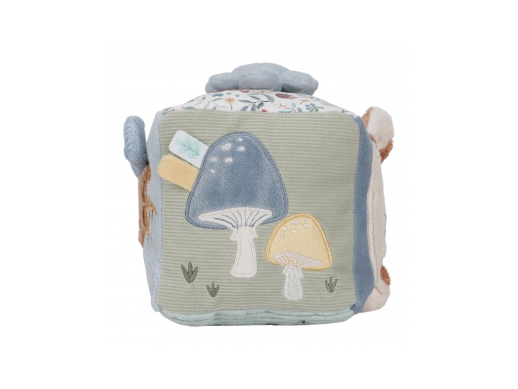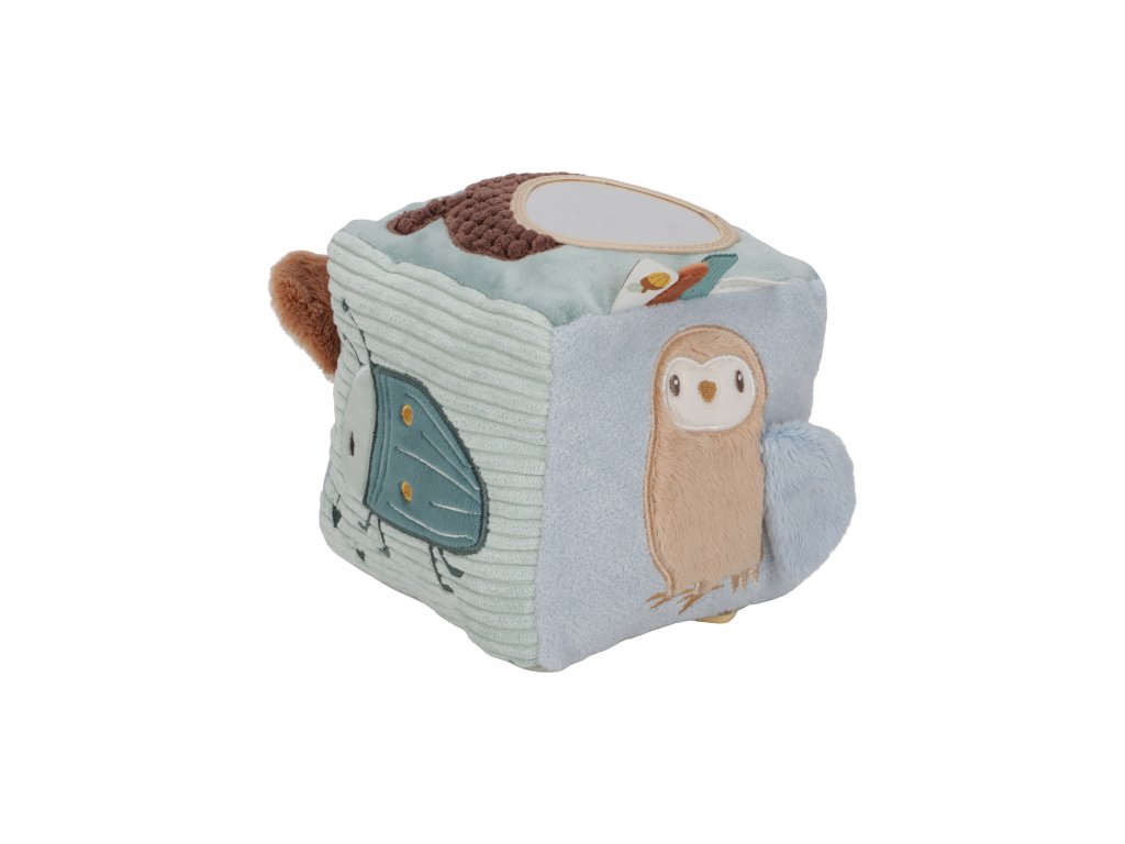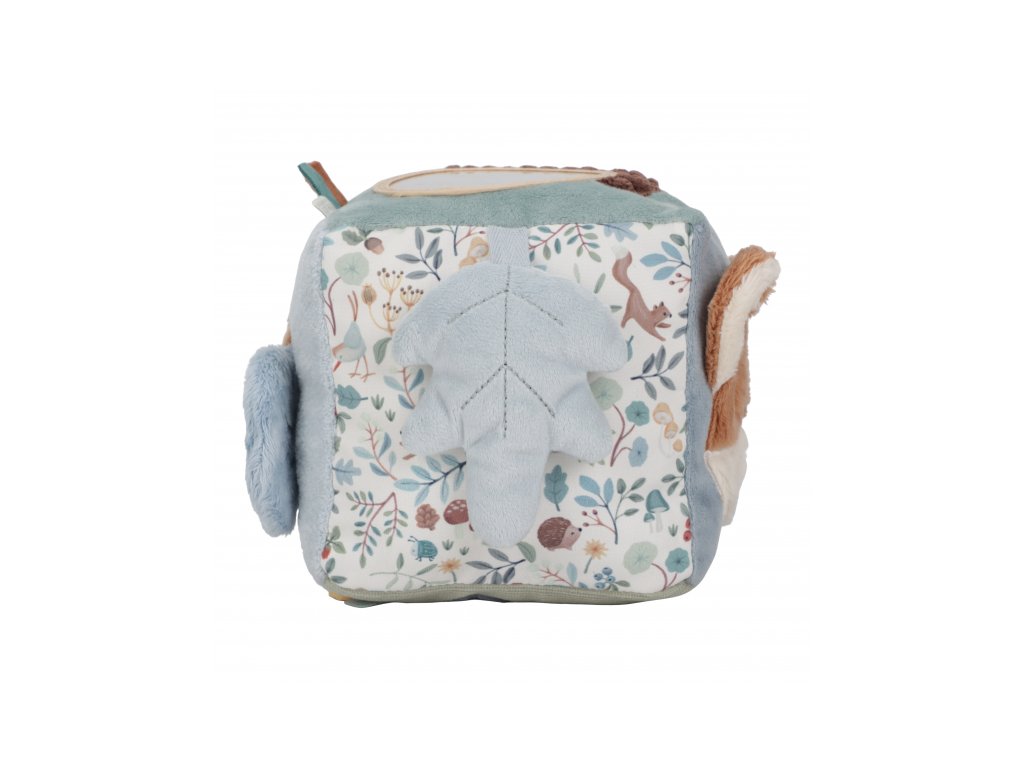 Mäkká plyšová kocka s krásnymi motívmi zo života v lese je vďaka svojmu prevedeniu ľahko uchopiteľná malými detskými ručičkami. Rôznorodé textúry, pripevnené hračky a vyšívané ilustrácie lákajú dieťa na skúmanie, kocka navyše pri pohybe jemne cinká.
