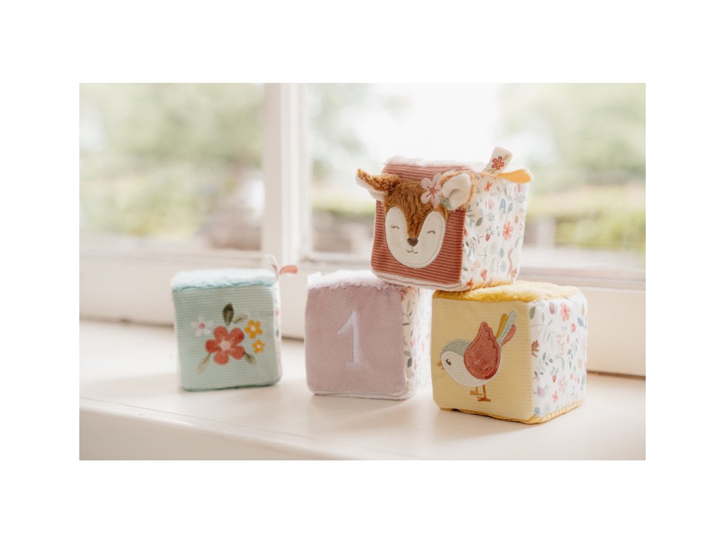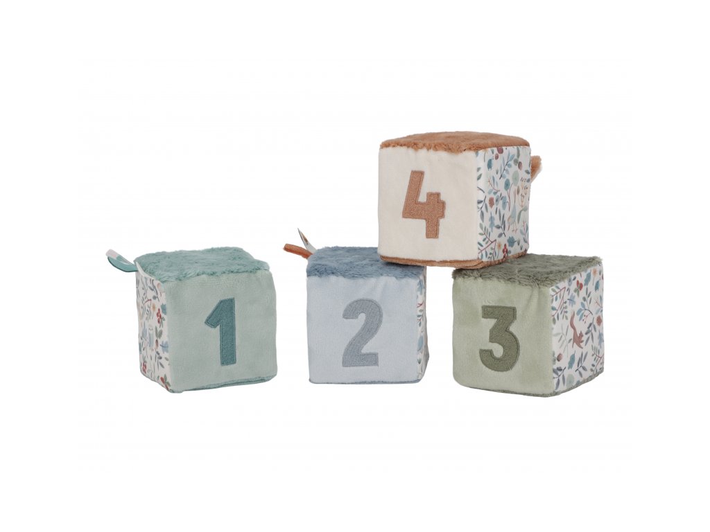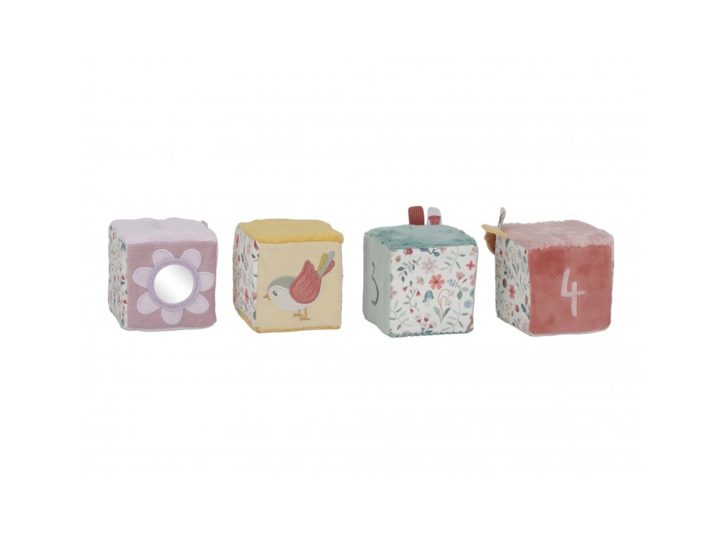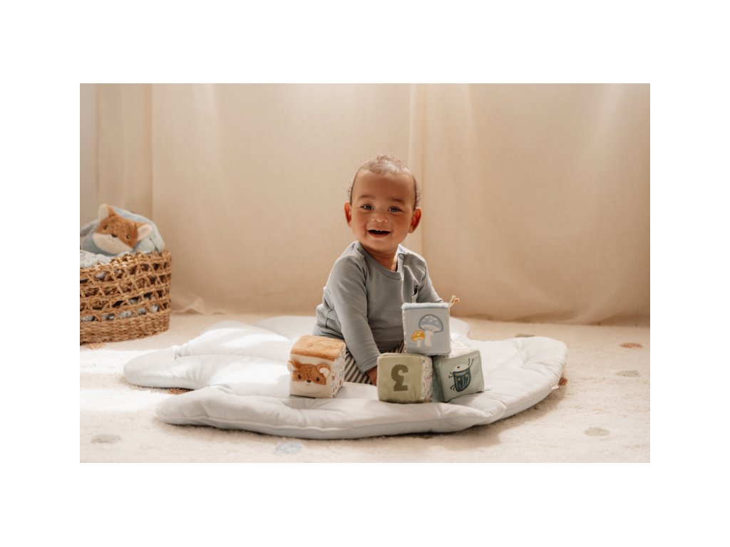 Mäkké textilné kocky s krásnymi motívmi zo života na záhrade sú vďaka svojmu prevedeniu ľahko uchopiteľné malými detskými ručičkami. Rôznorodé textúry a vzory lákajú dieťa na skúmanie, kocky navyše pri pohybe jemne cinkajú a hrkajú.