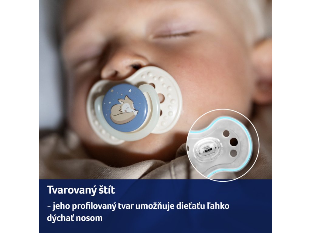 Umožňuje dieťaťu voľne dýchať nosom. Je vyrobený z bezpečného materiálu, ktorý neobsahuje BPA. Jedinečný okraj štítku je vyrobený zo zdravotníckeho materiálu, je príjemný na dotyk a zabraňuje otlačeniu cumlíka.