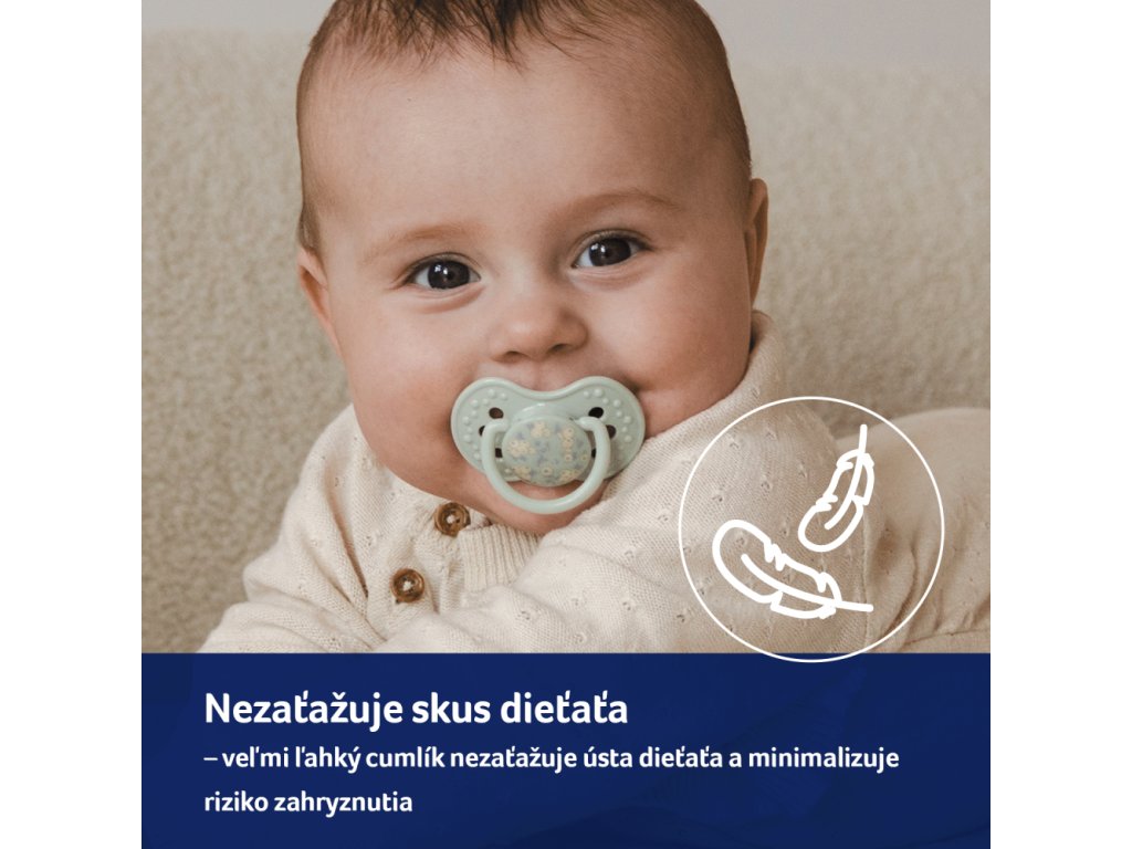 Veľmi ľahký cumlík, ktorý nezaťažuje detské ústa a minimalizuje tak riziko vzniku krivých zubov (malooklúzia).