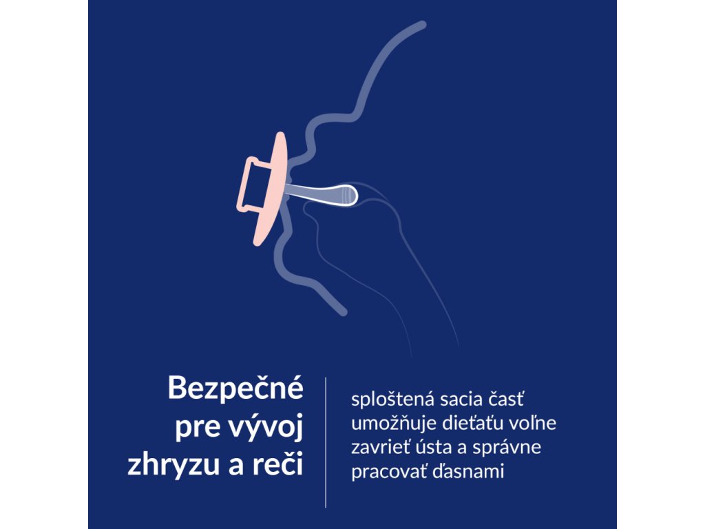Sploštená sacia časť umožňujú dieťaťu voľne zavrieť ústa a správne pracovať ďasnami.