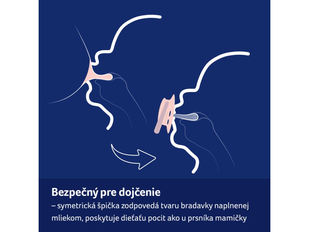 Symetrický tvar špičky podobný bradavke naplnenej mliekom, bábätku poskytuje podobný pocit ako pri prsníku mamičky.