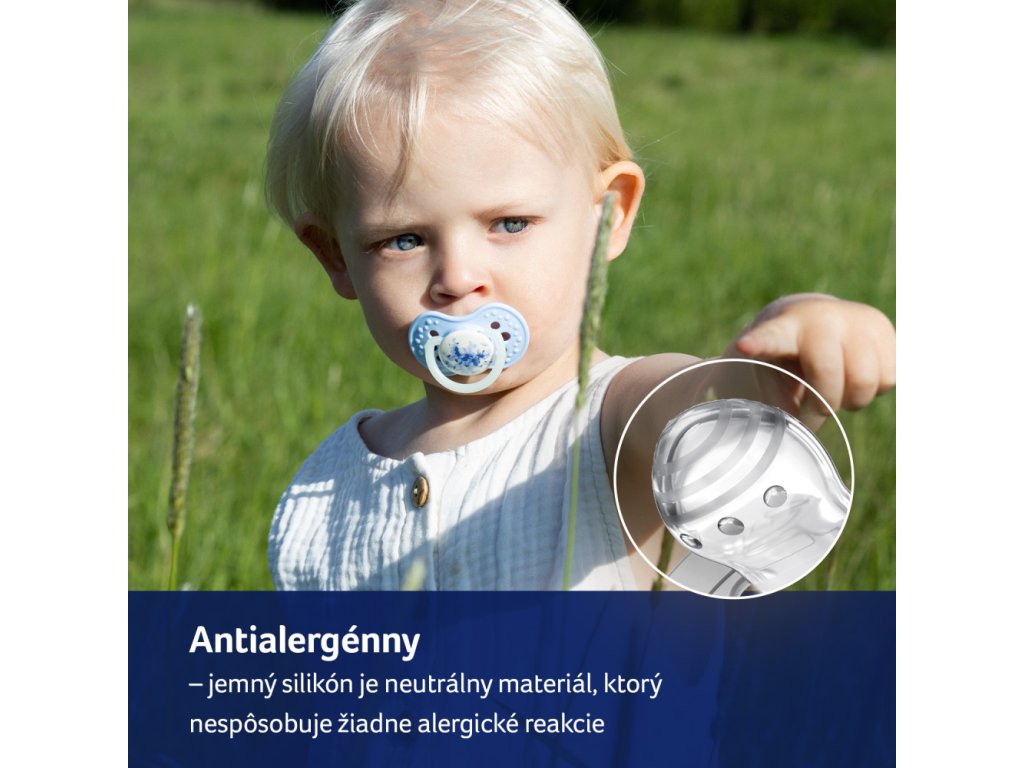Jemný silikón v cumlíku je pre bábätko neutrálnym materiálom, nevyvoláva alergické reakcie, je bez chuti a zápachu, čo je obzvlášť dôležité v tejto fáze, keď je dieťa citlivé na vonkajšie podnety.