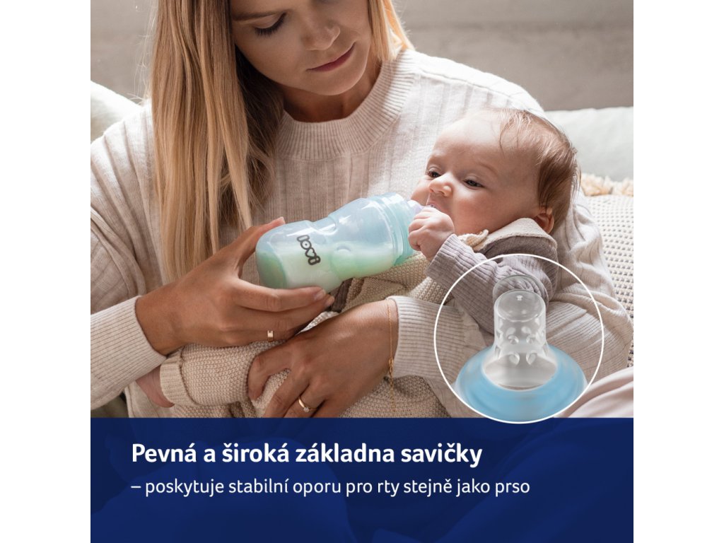 Široká profilovaná základňa - pevná základňa zo silnějšieho silikónu umožňuje stabilnú oporu pre správne umiestnenie pier na cumlíku na kŕmenie.