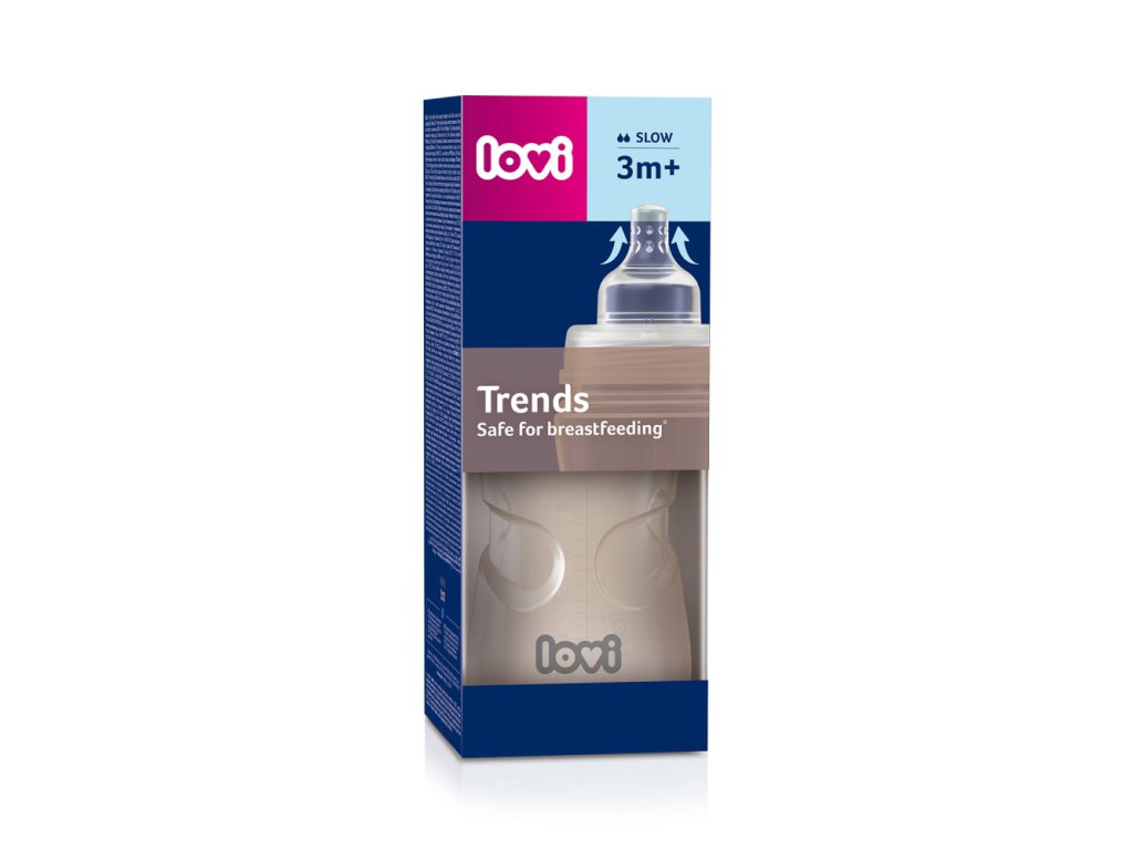 LOVI Fľaša Trends na kŕmenie detí odsatým mliekom od matky. Bezpečné pre dojčené dieťa, nenarúša sací reflex a nenarúša prirodzené kŕmenie. Je vybavená unikátnym cumlíkom na kŕmenie® s tenkým, vyčnievajúcim zakončením, tvrdou, profilovanou základňou a systémeom odvodu vzduchu SUPERvent. Fĺaša je kompatibilná so všetkými odsávačkami LOVI. LOVI Fľaše Trends je potlačená jemným dizajnom v súlade s najnovšími trendmi.