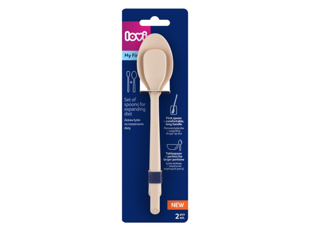 LOVI prvá kŕmiaca lyžička je plytká, úzka a pevná, takže je ideálna na začatie rozširovania stravy. Pohodlná dlhá rukoväť uľahčuje rodičom vyberanie jedla z pohára a kŕmenia a umožňuje dieťaťu ľahko uchopiť lyžičku. Lyžička LOVI má jedinečný tvar, podobný logopedickej špachtli, aby dieťaťu uľahčila vyberanie jedla z pohára.