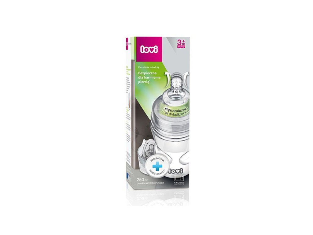 Samosterilizačná fľaša LOVI je bezpečná pre dojčené deti, pretože nenarušuje sací reflex. Vybavená špeciálne navrhnutým vrchnákom, ktorý umožňuje sterilizáciu fľaše a jej komponentov v mikrovlnnej rúre za necelých 90 sekúnd. Stačí do nej naliať príslušné množstvo vody, vložiť do nej všetky časti, prikryť fľašou a dať do mikrovlnnej rúry na 90 sekúnd. UPOZORNENIE: Značka LOVI odporúča dojčenie ako najzdravší spôsob kŕmenia. Ak dojčenie nie je možné, alebo je nedostatočné, začatie podávania pokrmu v alternatívnej podobe sa odporúča výlučne po konzultácií s lekárom, pôrodnou asistentkou, alebo lekárnikom.