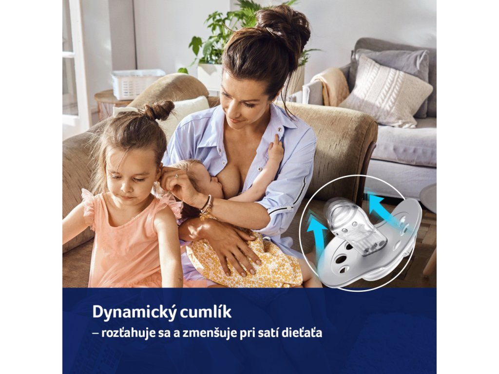 Jeho tvar umožňuje dieťaťu ľahko dýchať nosom; sú použité bezpečné materiálu bez bisfenolu A.