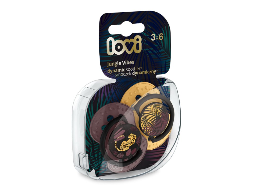 Silikónový dynamický cumlík LOVI® navrhnutý s pomocou neurologopédov. Jedinečný dizajn: heterogénny silikón a symetrický tvar inšpirovaný bradavkou. Nenarušuje sací reflex a prirodzený vývoj reči a zhryzu dieťaťa. Neobvyklý dizajn a farby cumlíka podčiarkujú jedinečnosť kolekcie JUNGLE VIBES.