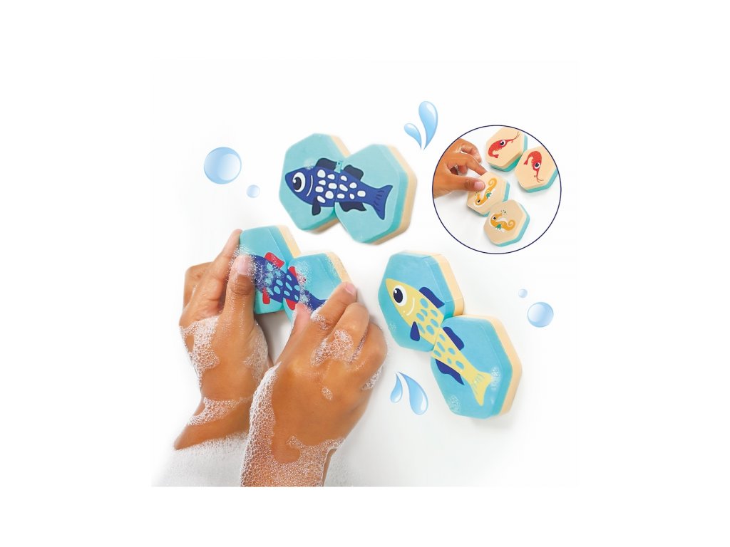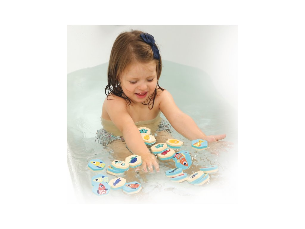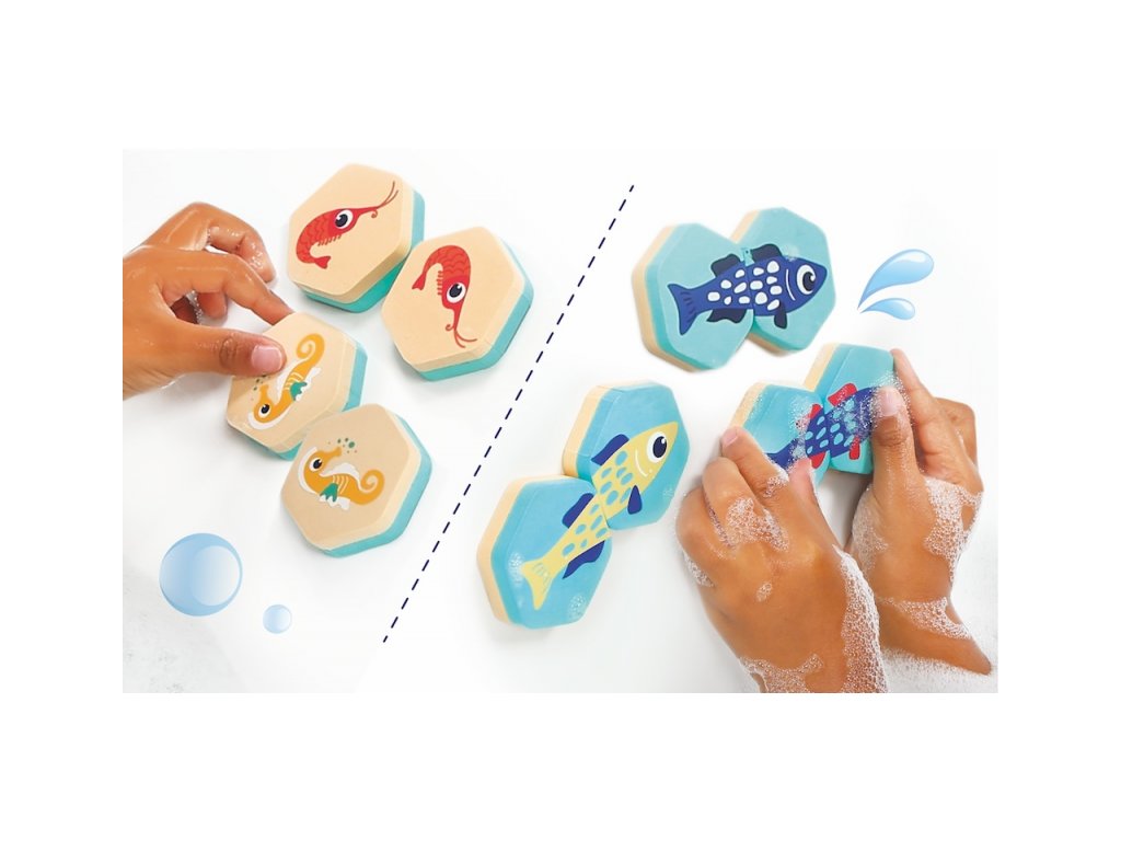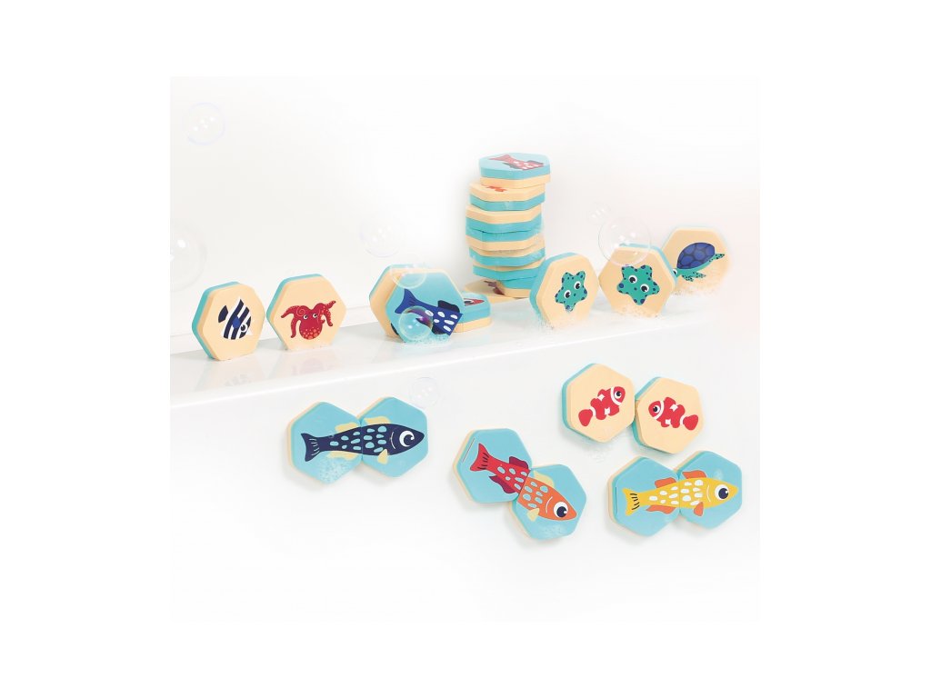 Obojstranné kartičky ponúkajú dve varianty hry - klasické pexeso a jednoduchá puzzle hra, pri ktorej dieťa hľadá dva diely, ktoré spolu tvoria farebnú rybičku. Vyhrané dvojice aj zložené rybičky si dieťa môže nalepiť na stenu vane.
