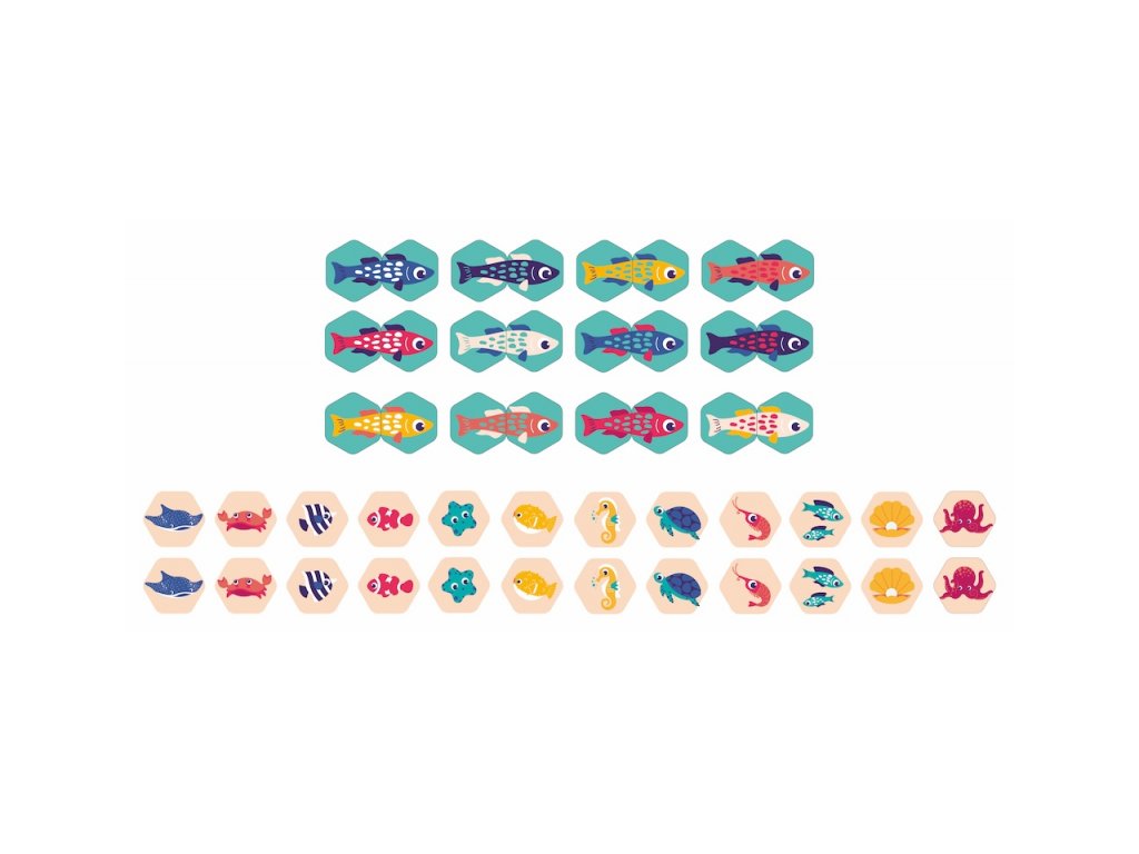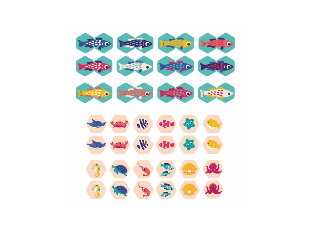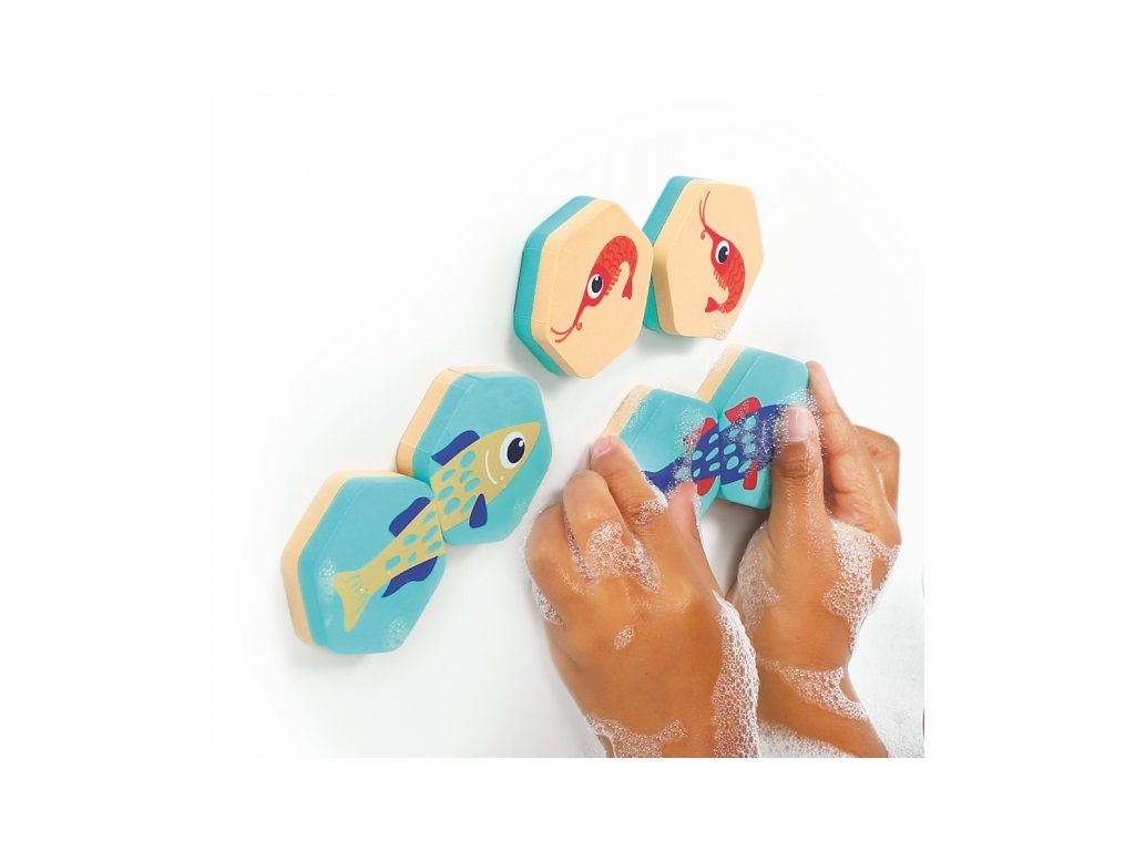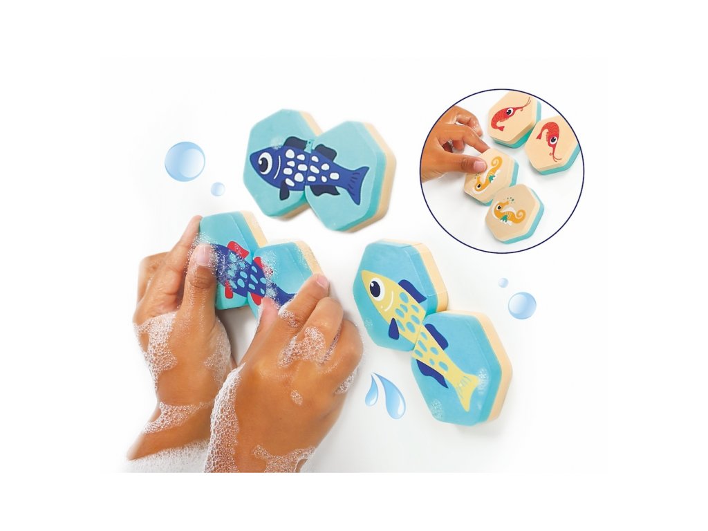 Obojstranné kartičky ponúkajú dve varianty hry - klasické pexeso a jednoduchá puzzle hra, pri ktorej dieťa hľadá dva diely, ktoré spolu tvoria farebnú rybičku. Vyhrané dvojice aj zložené rybičky si dieťa môže nalepiť na stenu vane.