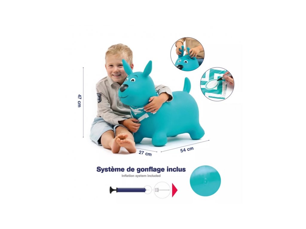 Nafukovací skákací pes pre deti ergonomického tvaru. Najmenším deťom pomôže pri ich prvých krôčikoch. Keď dieťa získa pri chôdzi istotu, začne objavovať kúzlo skákania. Uši slúžia ako držadlá. Okolo krku môžete psíkovi uviazať šatku s popisovacou menovkou, aby si dieťa svojho psíka mohlo pomenovať.