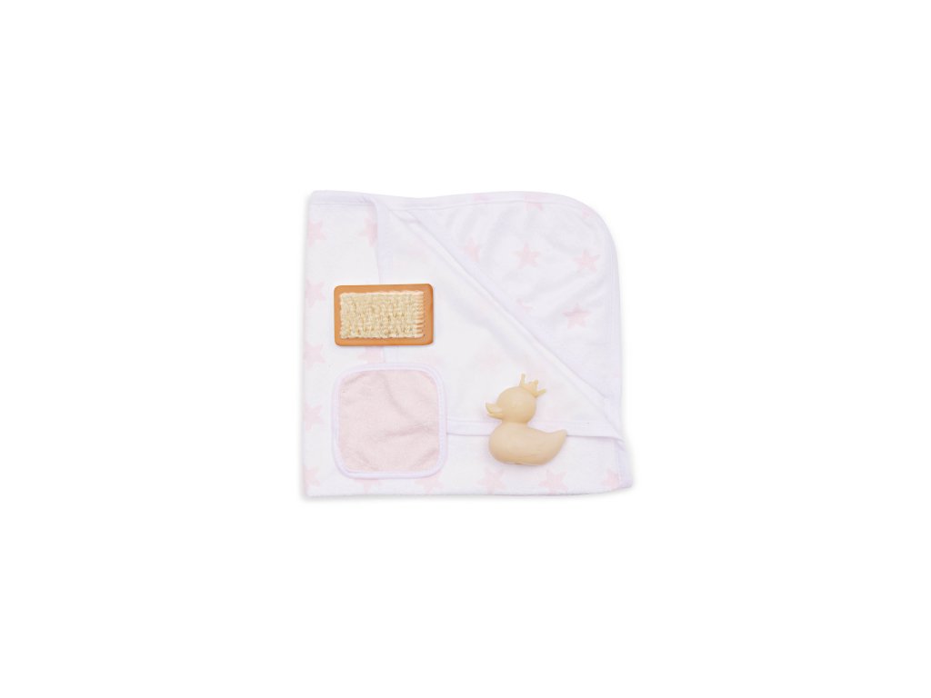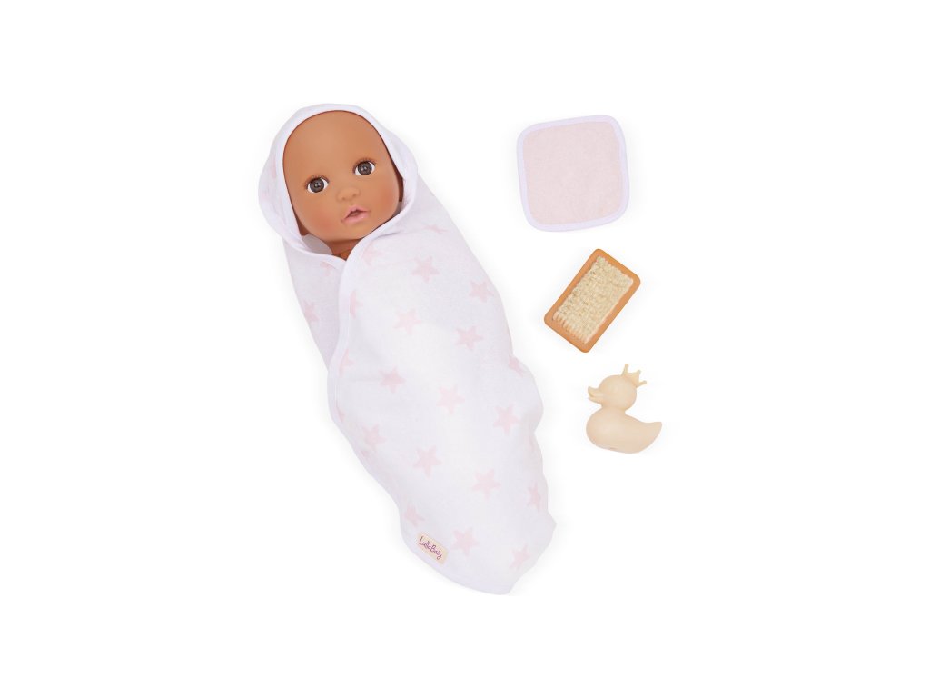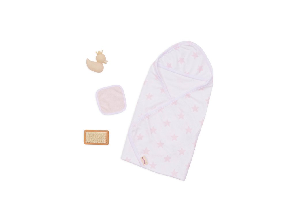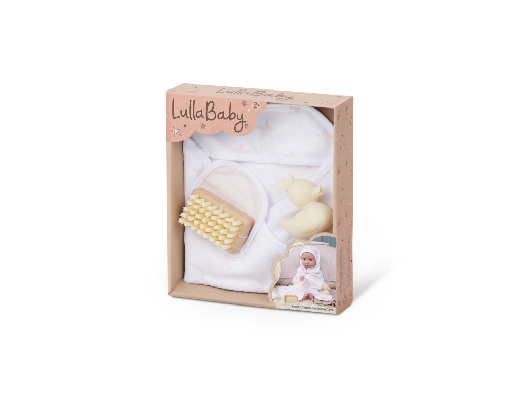 Sada osušky s doplnkami LullaBaby obsahuje všetko potrebné na hranie na kúpanie – deti môžu bábiku „umyť“ jemnou žinkou, kefou a samozrejme si užiť veľa zábavy s malou gumovou kačičkou. Po kúpeli je čas bábiku osušiť do mäkkej osušky s kapucňou, ktorá je zdobená ružovou potlačou s hviezdičkami. Celý set je ideálny pre rozvíjanie empatie, starostlivosti a fantázie pri hre s bábikami.