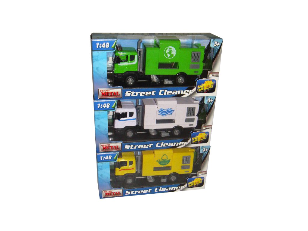 Krásny model upratovacieho vozidla. Tri rôzne druhy farebného prevedenia - zelená, biela a žltá. Vhodné pre deti od 3 rokov.Mierka 1:48,3assort