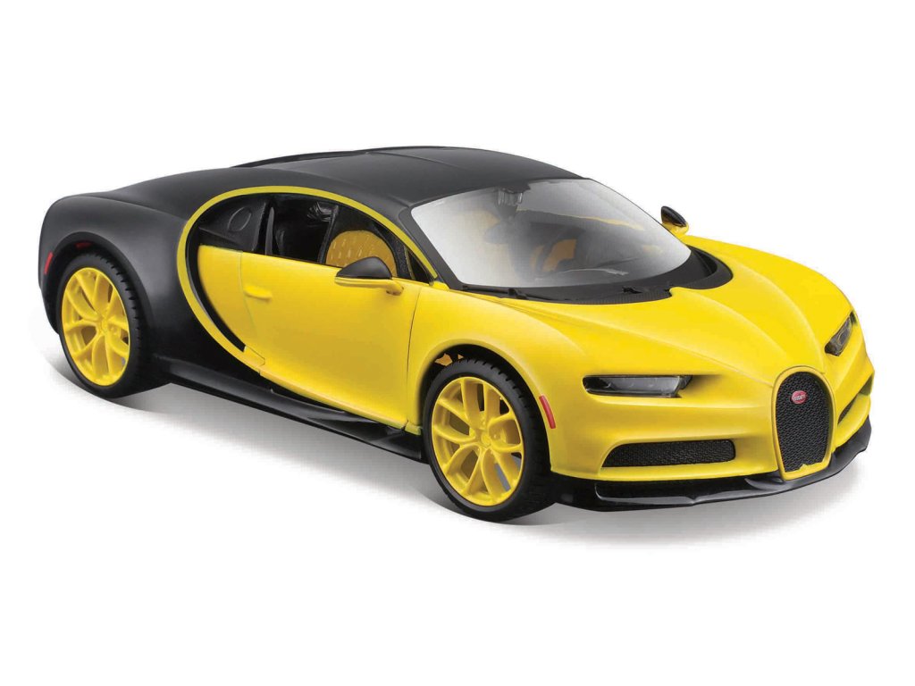 Bugatti Chiron. Kovový model športového auta značky Bugatti Chiron v mierke 1:24. Model má veľmi dokonalé, detailné prevedenie jednotlivých častí a kvalitné farebné prevedenie. Auto má otvárateľné dvere. Kovový model s plastovými doplnkami v atraktívnej žlto-čiernej farbe. Rozmery balenia: 22,8 x 10,5 x 11,4 cm. Vek: 3+