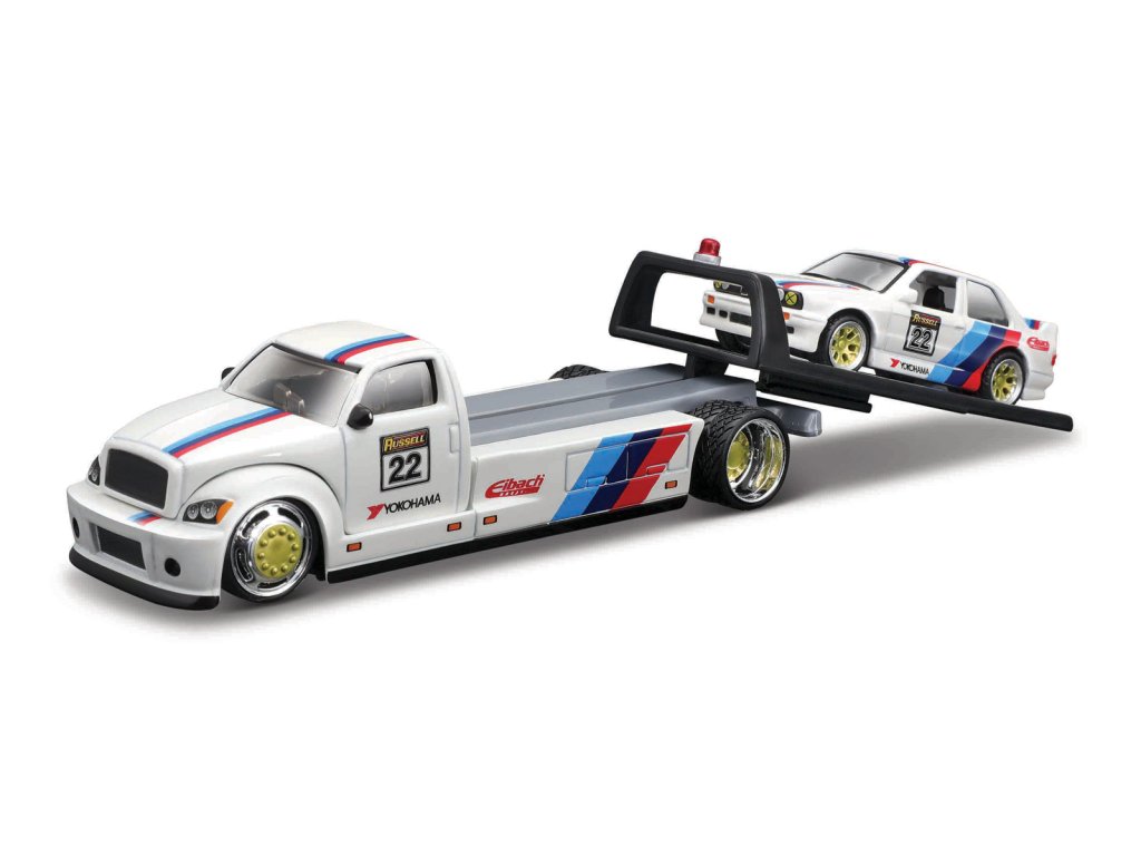 Maisto Flatbed + 1988 BMW M3. Jedna z najdlhšie fungujúcich radov na zákazku odlievaná pod tlakom, tieto sady pre 2 vozidlá sú silnejšie ako kedykoľvek predtým. Či už vás na budúci autosalón ťahajú alebo vezú na valníku, Elite Transport je tou správnou cestou. Vrátane dvoch vozidiel. Telo z tlakovo liateho kovu s plastovými dielmi. Rozmery: 22,2x17,15x4,2cm. Vek: 8+