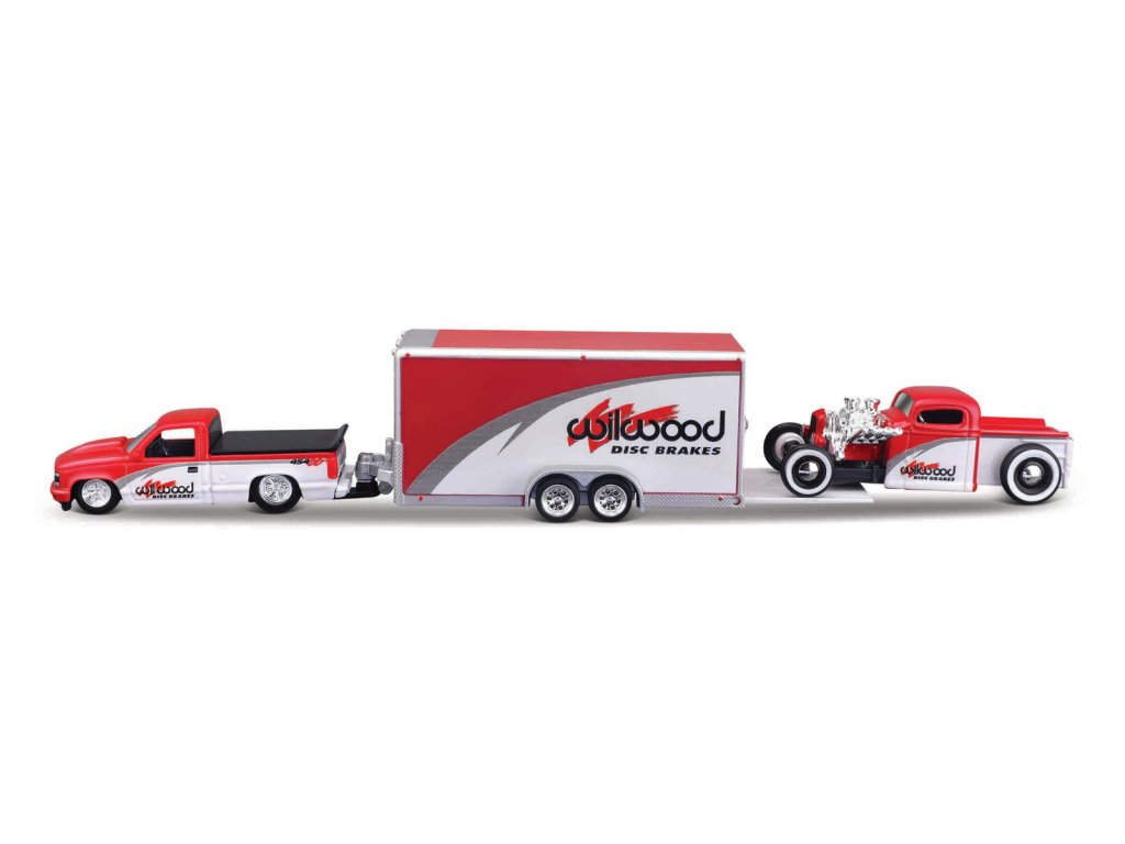 1993 Chevrolet 454 SS Pick-up, Car Trailer, 1936 Chevy Pickup. Kovové auto s vlekom + kovové autíčko v mierke 1:64. Modely autíčok s perfektným prepracovaním a dizajnom majú kvalitné kovové osi kolies. Balenie: 29,2x7,3x6cm. Vek: 8+