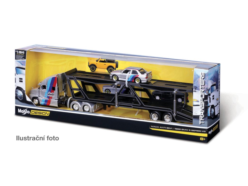 Design Transporters 1:64 Kamión prepravník s autíčkom. Kovové modely s plastovými doplnkami. Prepravník aj autíčko sú v mierke 1:64. Varianty: International® LoneStar® 2021 + Ford Bronco Badlands, Mack Anthem® 1988 + BMW 3 Series M3, Mack Anthem® 1993 + Chevrolet® 454 SS Pickup a Mercedes-Benz Actros 1851 + 1990 Mercedes-Benz 190E. Assort je náhodný mix modelov. Výber nie je možné ovplyvniť. Balené v krabičke. Nevhodné pre deti do 3 rokov. Rozmery balenia: 12,35 × 38,42 × 6,35 cm. Vek: 8+