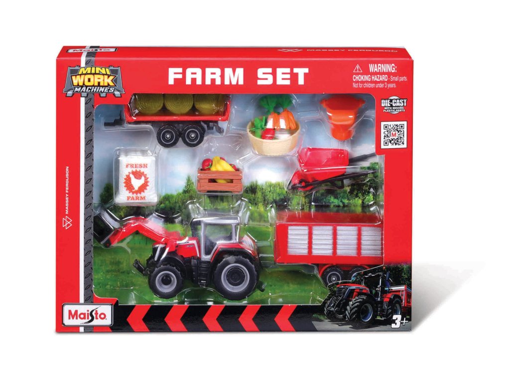 Farmársky set, Massey Ferguson. Plastový model traktora Massey Ferguson. Kovová kabína a plastové prvky. Obsahuje 2 prívesné vozíky a príslušenstvo na vybudovanie vlastnej farmy. Rozmery balenia: 20 x 15,2 x 4,5 cm. Vek: 3+.