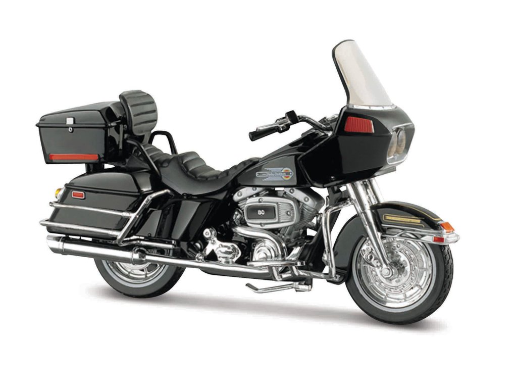 Harley-Davidson Motorcycles 1:18 – 1988 FLT Tour Glide™, čierna. Model zo série 45 collection v mierke 1:18 má veľmi dokonalé, detailné prevedenie jednotlivých častí a kvalitné farebné prevedenie. Kovový model s plastovými doplnkami. Motocykel má riaditeľnú vidlicu, pohyblivý bočný stojan a odpruženú zadnú nápravu. Model je usadený na podstavci. Balené v krabičke. Nevhodné pre deti do 3 rokov. Rozmery balenia: 10,2 x 17,8 x 7 cm. Vek: 3+