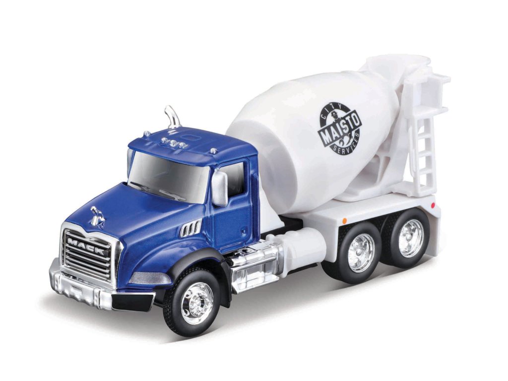 Mack Granite trucks, miešačka. Mäkké gumové otočné pneumatiky. Oknom sa dá prezrieť interiér. Pohyblivé časti. Balenie: 17,1x8,2x7cm. Vek: 3+