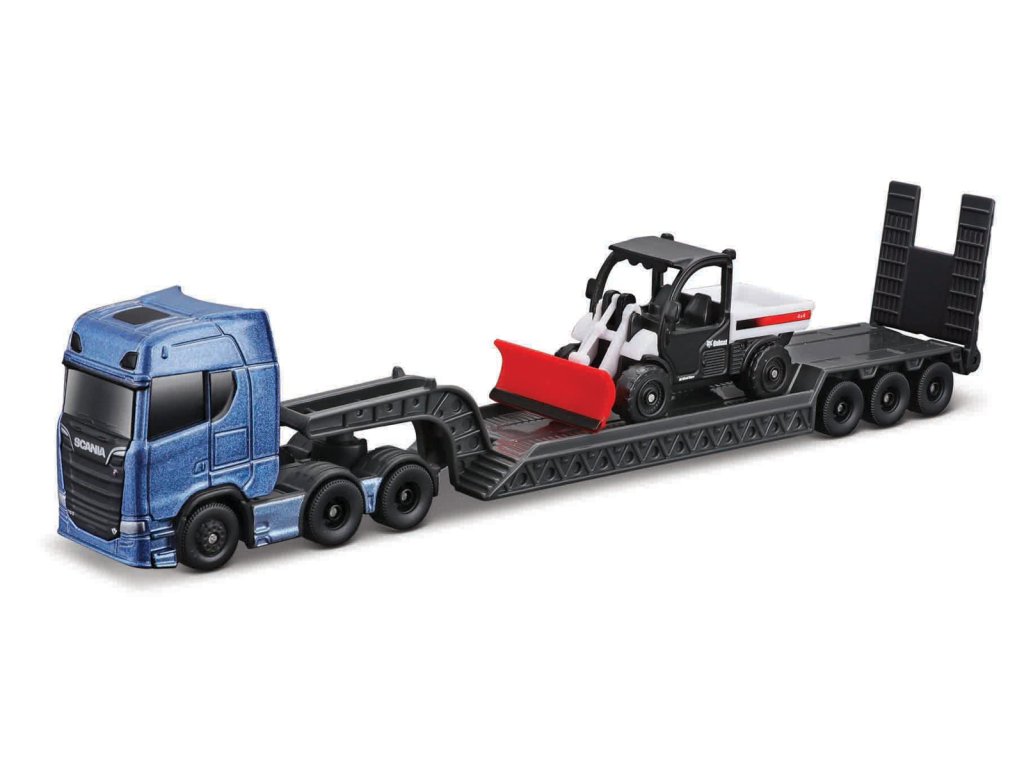 Scania 770S, Bobcat T590 G. Veľký a silný ťahač, ktorý vezie mini verziu pracovného stroja. Kovové autíčko s plastovými detailmi a skutočnými gumovými pneumatikami. Farebné prevedenie výrobku a design sa môže líšiť. Balenie: 27,5x8x4,8cm. Vek: 8+