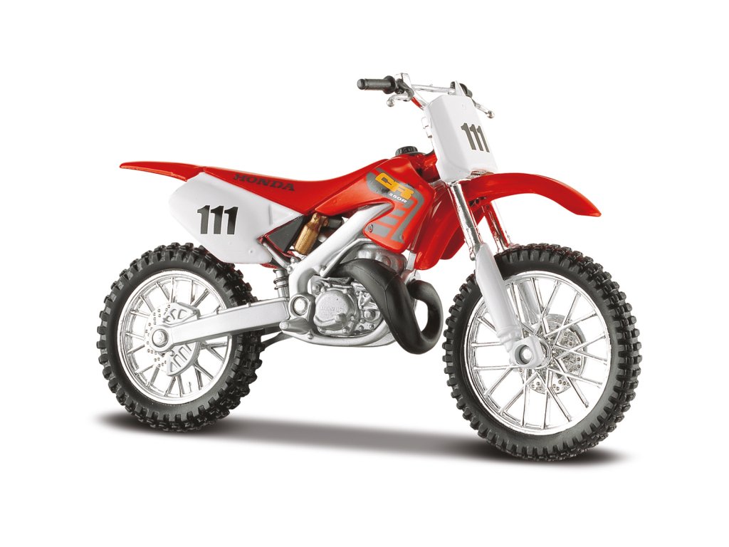 Honda CR250R. Kovové modely motocyklov v mierke 1:18. Motocykle majú otáčavé riadidlá a odpruženú zadnú nápravu. Sú usadené na čiernom plastovom podstavci. Rozmery balenia: 16x10,5x7cm. Vek: 3+