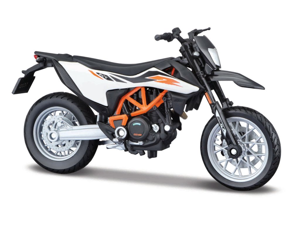 KTM 690 SMC R. Kovové modely motocyklov v mierke 1:18. Motocykle majú otáčavé riadidlá a odpruženú zadnú nápravu. Sú usadené na čiernom plastovom podstavci. Rozmery balenia: 16x10,5x7cm. Vek: 3+