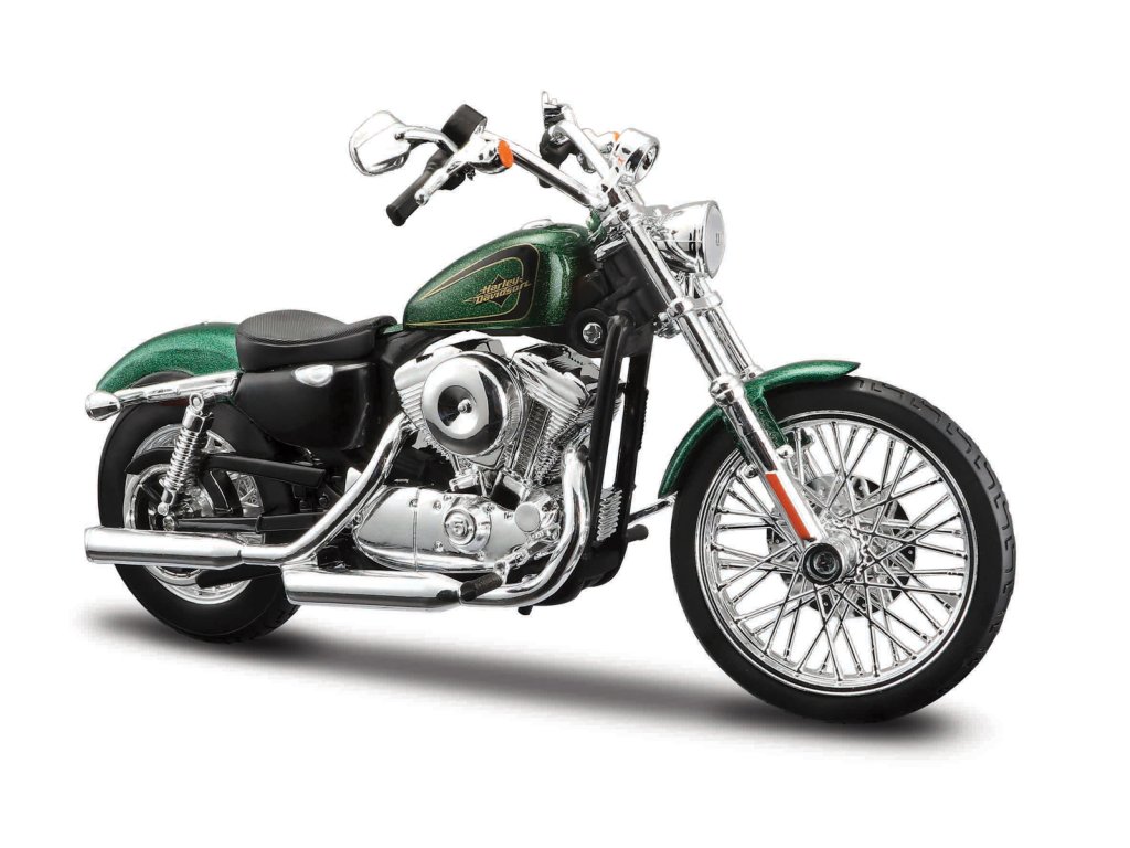2013 XL 1200V Seventy-two. Model motocykla v mierke 1:12 má u svojich fanúšikov veľkú obľúbenosť pre jeho dokonalé prevedenie a predovšetkým veľkosť cca. 16 cm. Motocykel má otáčavé riadidlá a odpruženú zadnú nápravu. Balené v krabičke. Balenie: 22,23x12,7x8,9cm. Vek: 3+