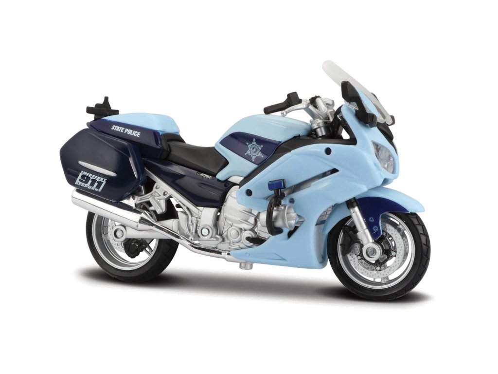 YAMAHA FJR 1300A, US - State Trooper. Model policajného motocykla. Modely odlievané pod tlakom sú presnou replikou originálov a majú voľný otočný mechanizmus, vďaka ktorému sú zábavnou hračkou pre deti. Balenie: 15,7x10,4x6,8cm. Vek: 3+