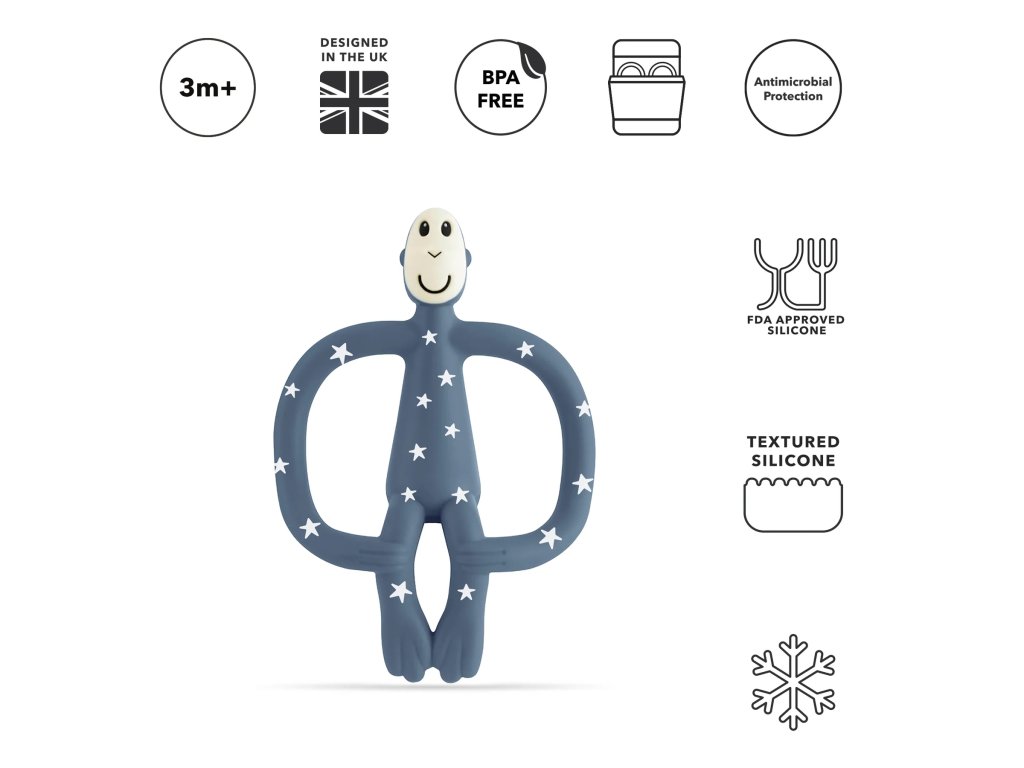 Veselé, ohybné a ideálne do drobných detských rúčok – vaše dieťa môže hryzadlo pohodlne používať a dostať sa priamo k zdroju bolesti. Textúrované výstupky Matchstick Monkey pomáhajú naniesť gél na presné miesta bez potreby prstov.
