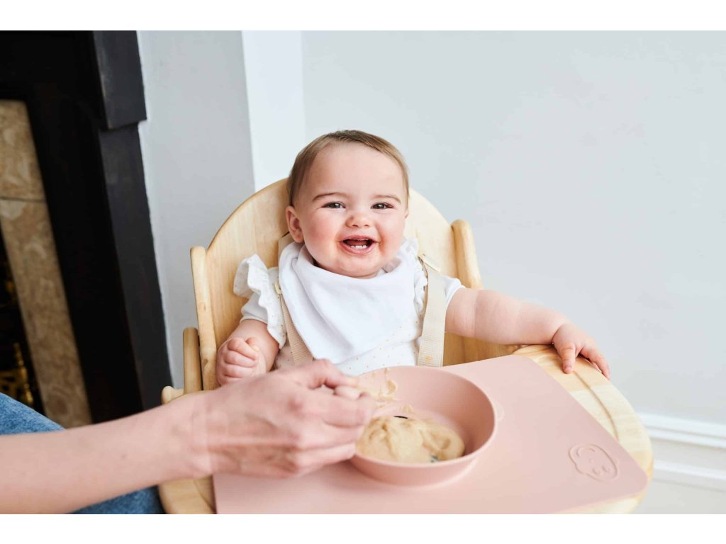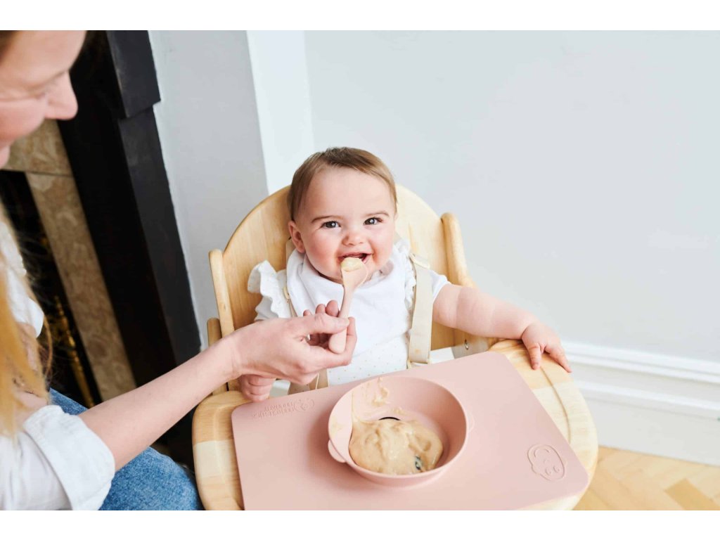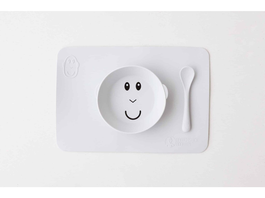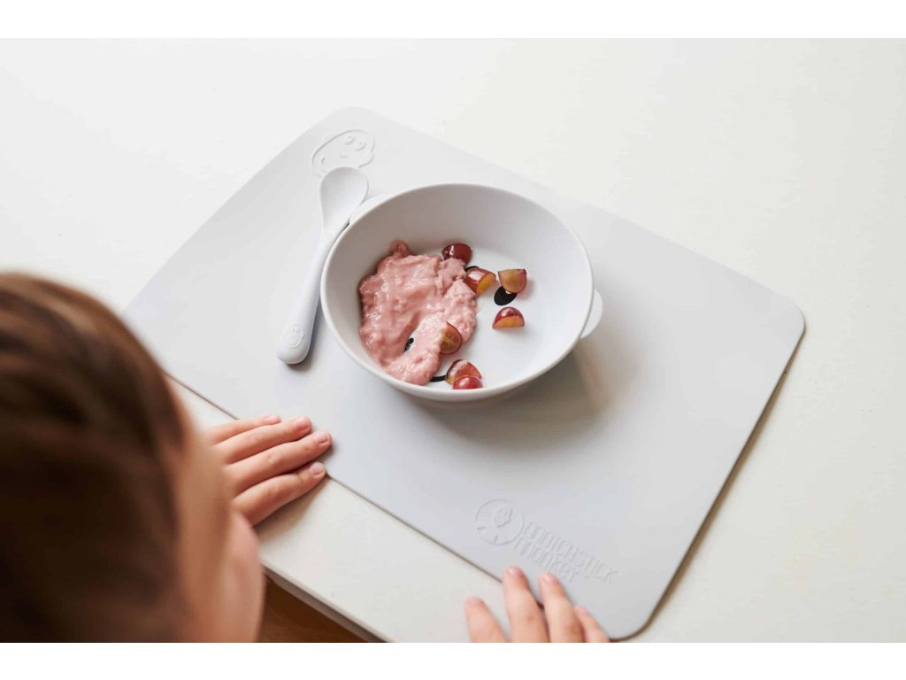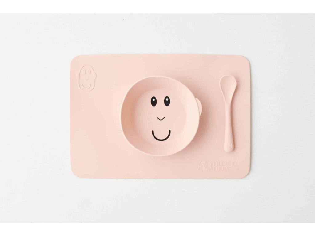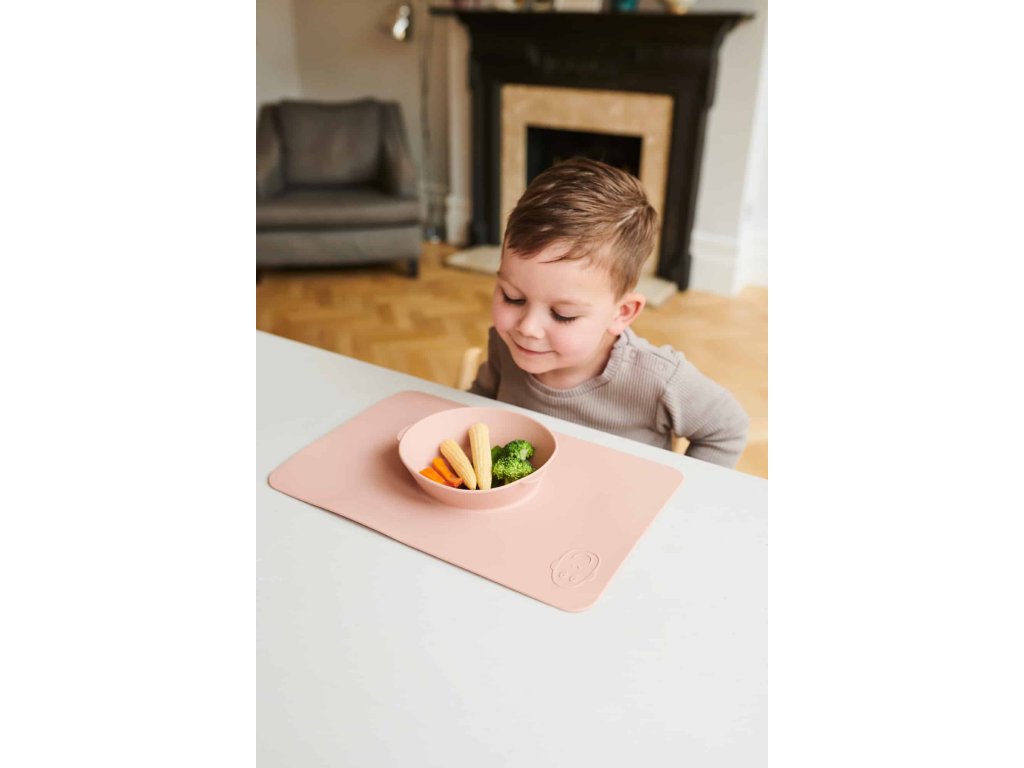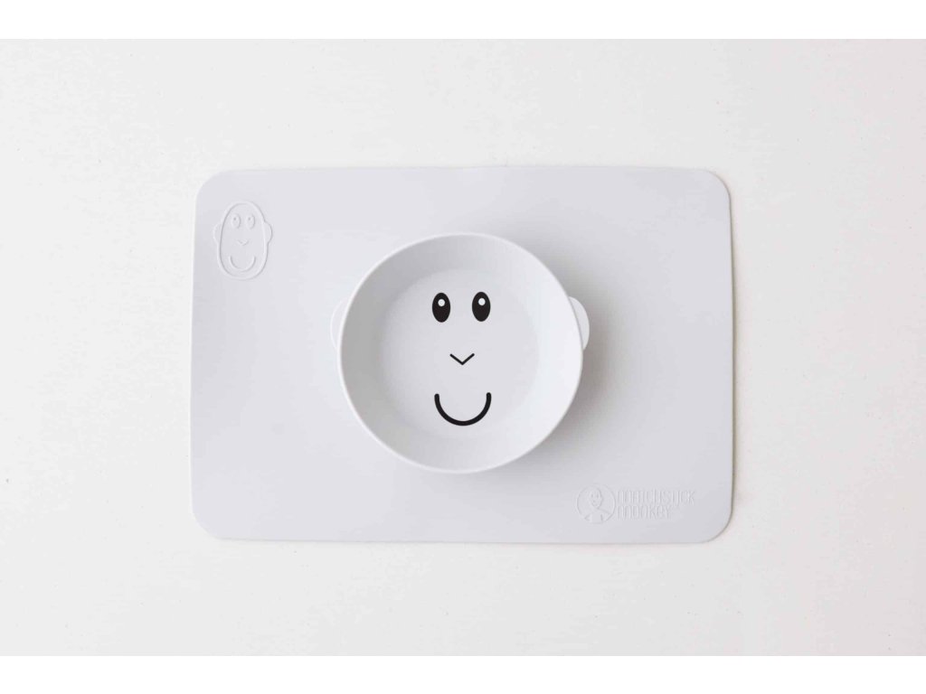 Protišmyková podložka s integrovanou miskou Matchstick Monkey v sviežich farbách a hravom dizajne je dokonalou pomôckou pre neporiadnych jedákov.